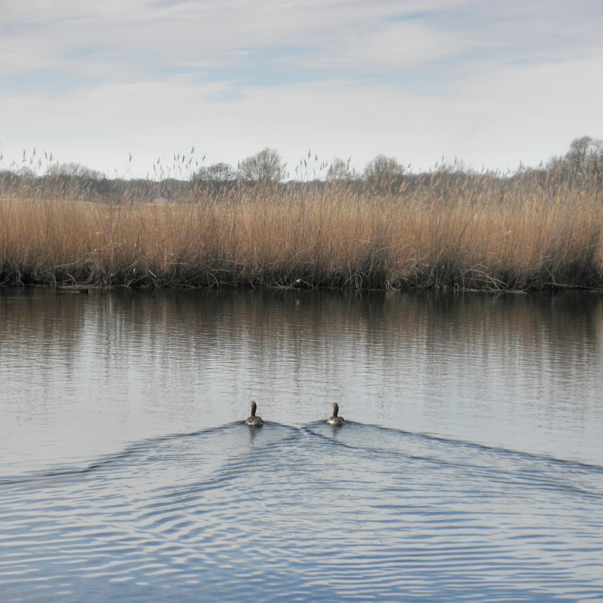Zwischen Großfunkstelle und Dorf Weinberg sehe ich so etwa hundert Kraniche, und noch mehr Gänse. Später erfahre ich von Herrn Rixmann, daß der Großteil sich in der Umgebung von Nauen ist, weil sie dort mehr Futter finden. Noch etwa 10000 sollen da sein laut Zählung(was eine Hochrechnung ist). Einige davon überwintern dort, denn Kälte macht es ihnen nichts aus, andere ziehen noch weiter. Wenn sie günstige Thermik finden, steigen sie hoch und nützen den Wind. Dann werden sie innerhalb 3 Tagen in Spanien sein. Ich wunderte mich immer, wie die Zugvögel ohne Schlaf so lange Strecken ohne Pause fliegen können. Neue Erkenntnisse zeigen scheinbar, daß sie eine Gehirnhälfte zum Schlaf schicken können, also im Halbschlaf fliegen. Das wäre vielleicht auch praktisch für uns.