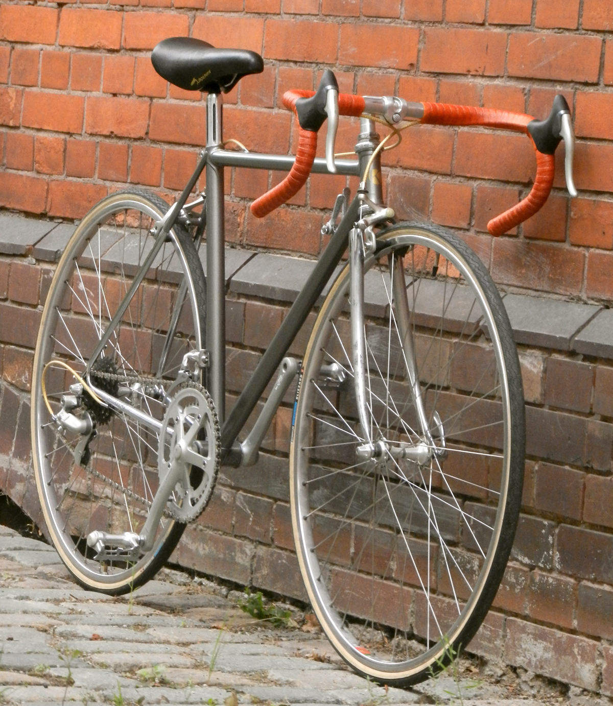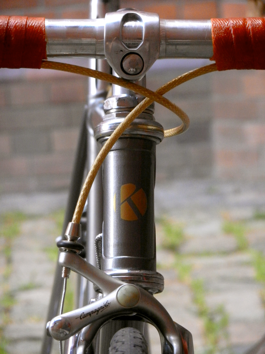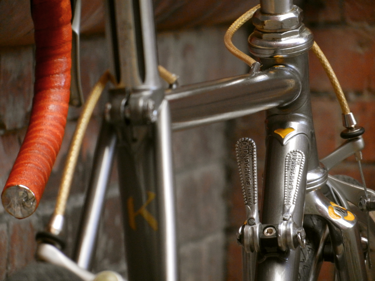 Ich dachte zuerst, reinrassig mit Campa aufzubauen. Aber die Rahmenfarbe(warme Silbermetallic) passt ganz gut mit Shimano 105 Teile mit auch warmen Farbton. Gravur und Muffenfester wurde gelb abgesetzt. Lenkerband ist vom Newbaum(Orange) und daruf wurde Schellack mehrfach gepinselt, so daß er wetterbeständig und langlebig ist.