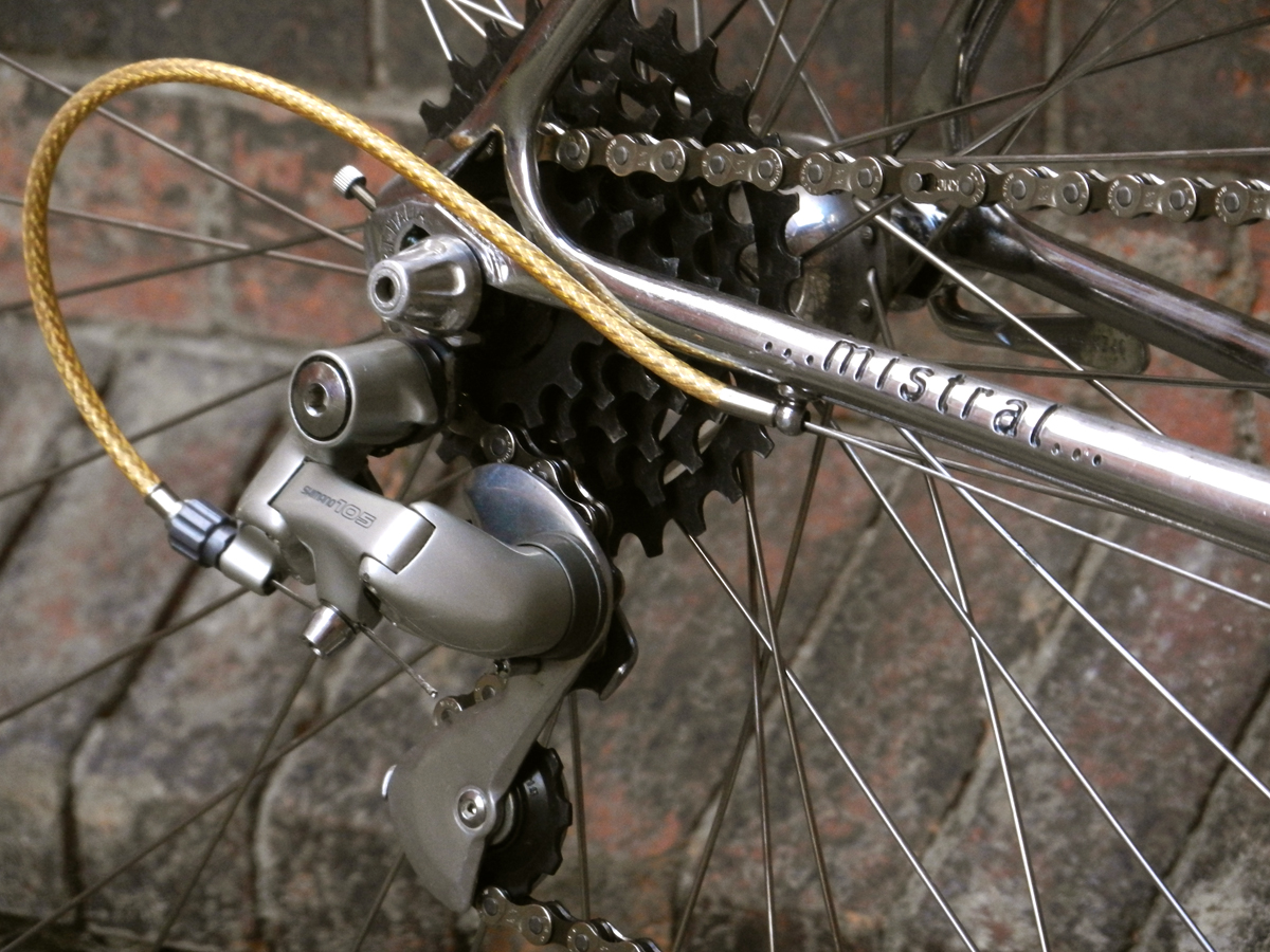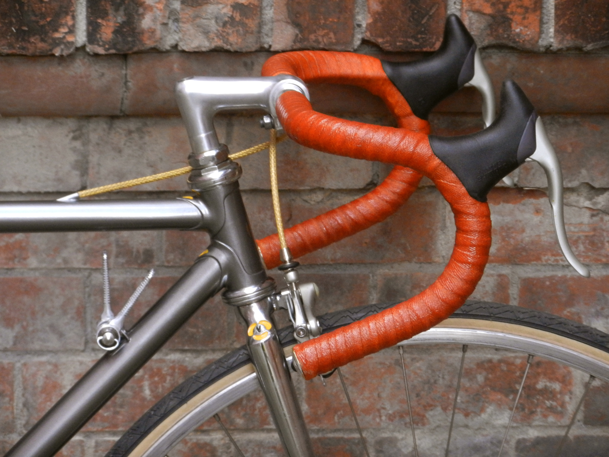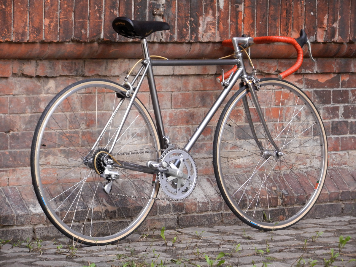 Ich dachte zuerst, reinrassig mit Campa aufzubauen. Aber die Rahmenfarbe(warme Silbermetallic) passt ganz gut mit Shimano 105 Teile mit auch warmen Farbton. Gravur und Muffenfester wurde gelb abgesetzt. Lenkerband ist vom Newbaum(Orange) und daruf wurde Schellack mehrfach gepinselt, so daß er wetterbeständig und langlebig ist.
