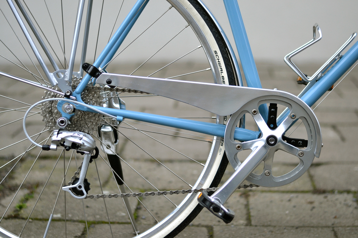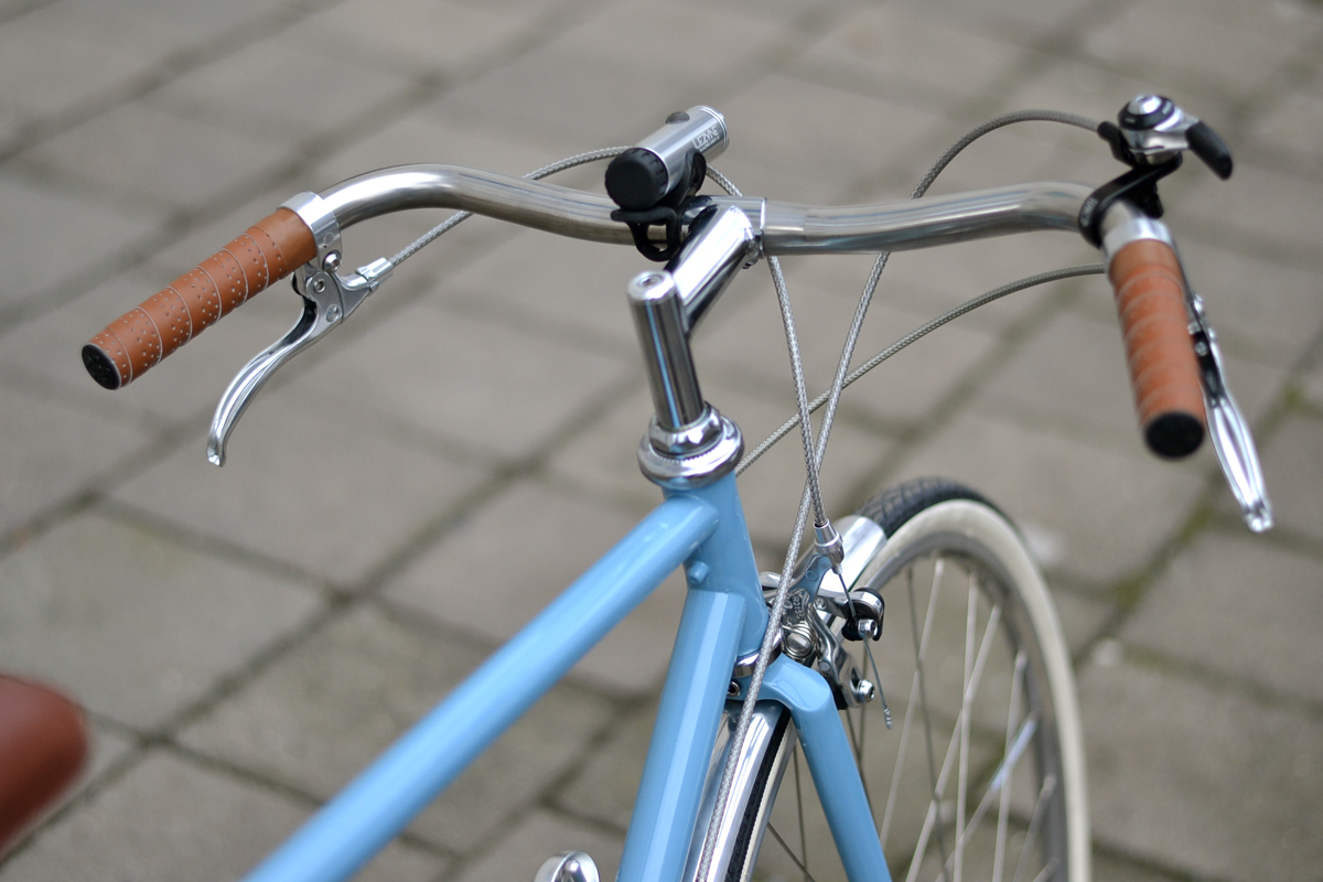 Daraus entstand ein vollausgestattetes Fahrrad, das trotzdem nicht so schwer ist, obwohl hier Stahlsteuersatz, -vorbau wie -Lenker wegen gewünschter Haltbarkeit eingebaut wurde.