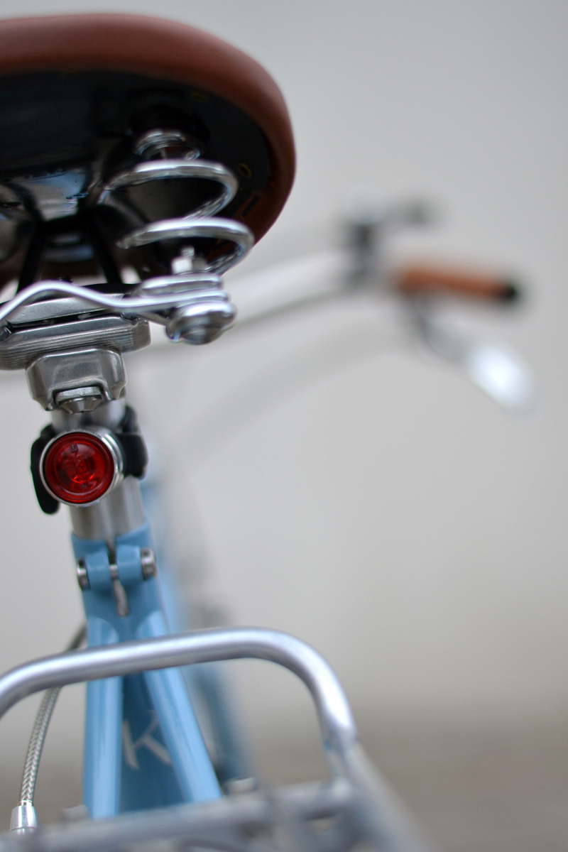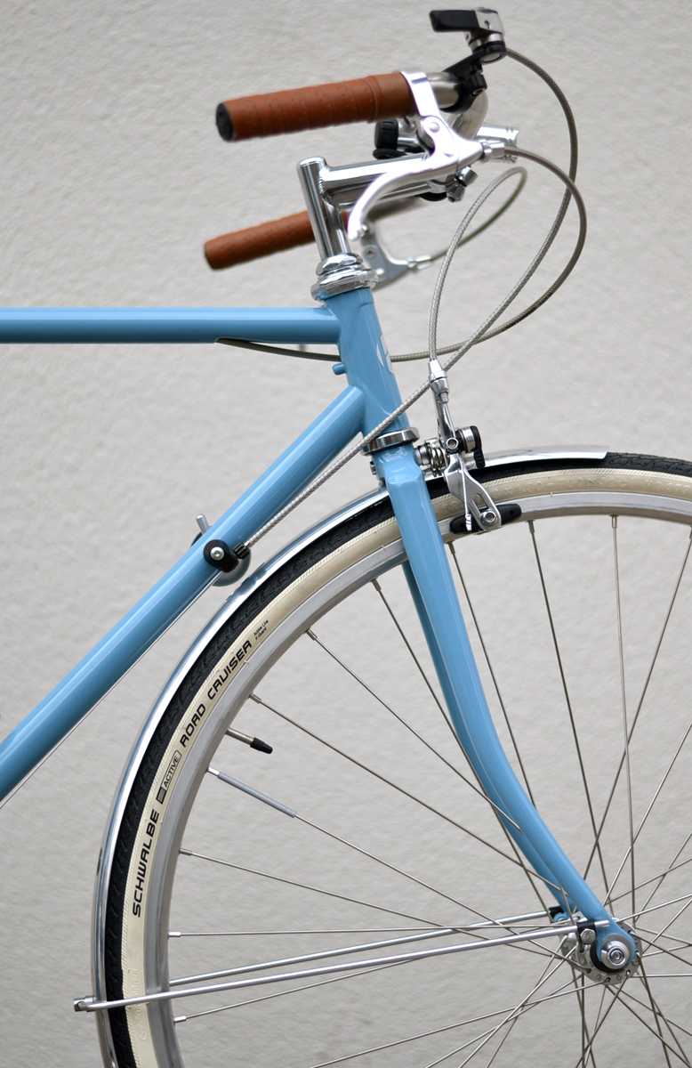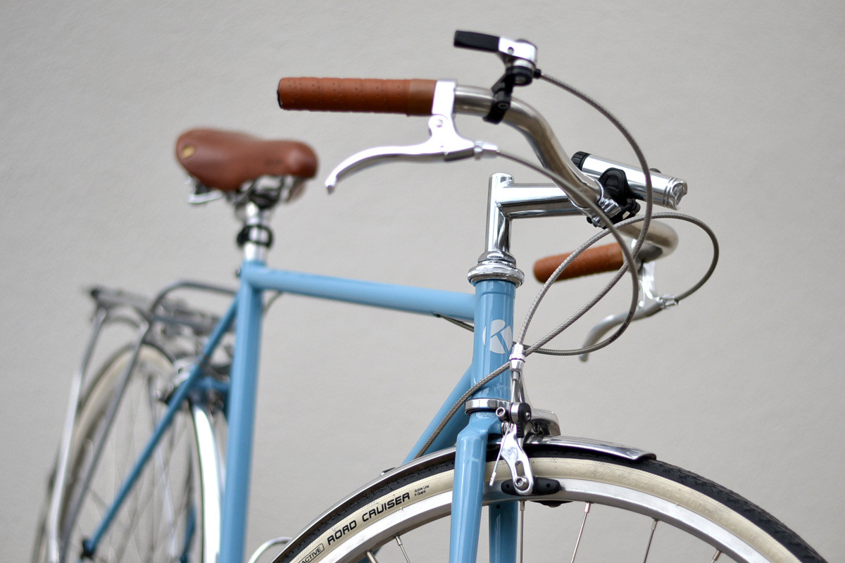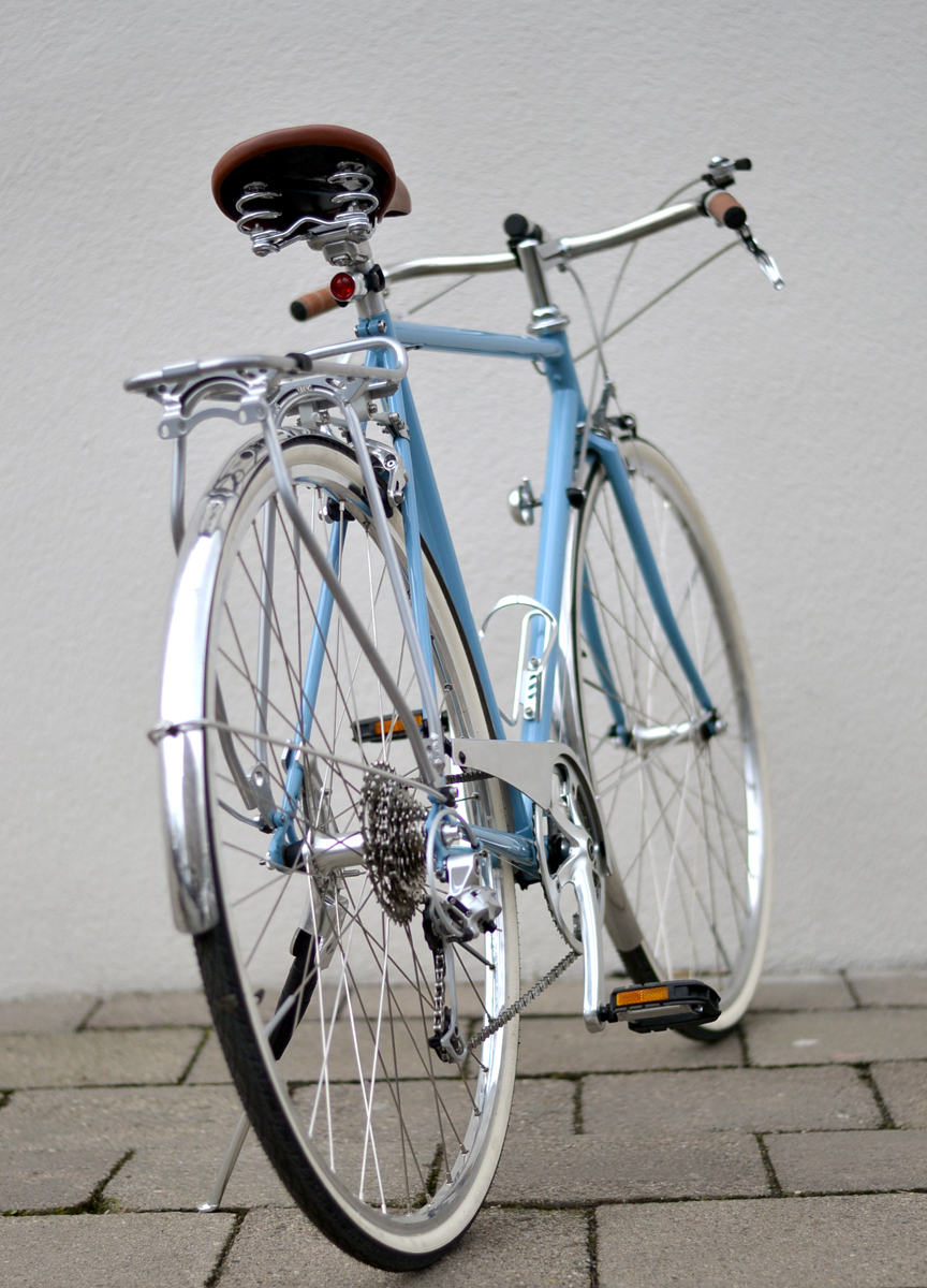 Auf Nabendynamo wurde verzichtet und dafür schöne Lampen von Lyzene ausgesucht, die in Sommermonaten zuhause bleiben können. Einen bequemen Sattel fand ich in Großbritanien, von Dawes, mit Geleinlage und verchromten Federn. Schaltung ist mit Shimano LX 9-fach hochwertig. Übnersetzung ist mit 44Z-11/34Z sehr variabel. Naben sind durable Tiagra 36L. 32mm breite Reifen von Schwalbe Road Cruiser ist sicher genug in der Stadt. Gepäckträger von Racktime/Tubus ist stabil genug für 25kg Last wenn es beansprucht wird.
