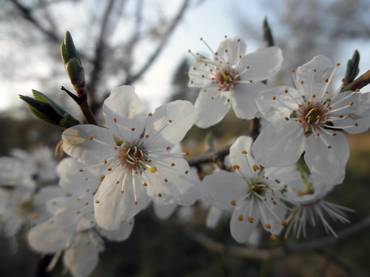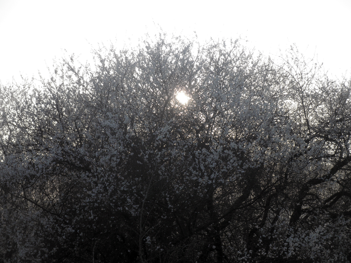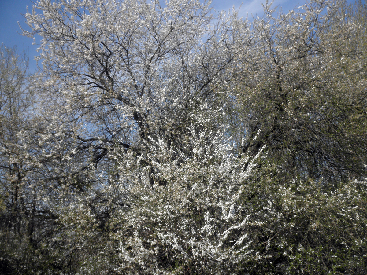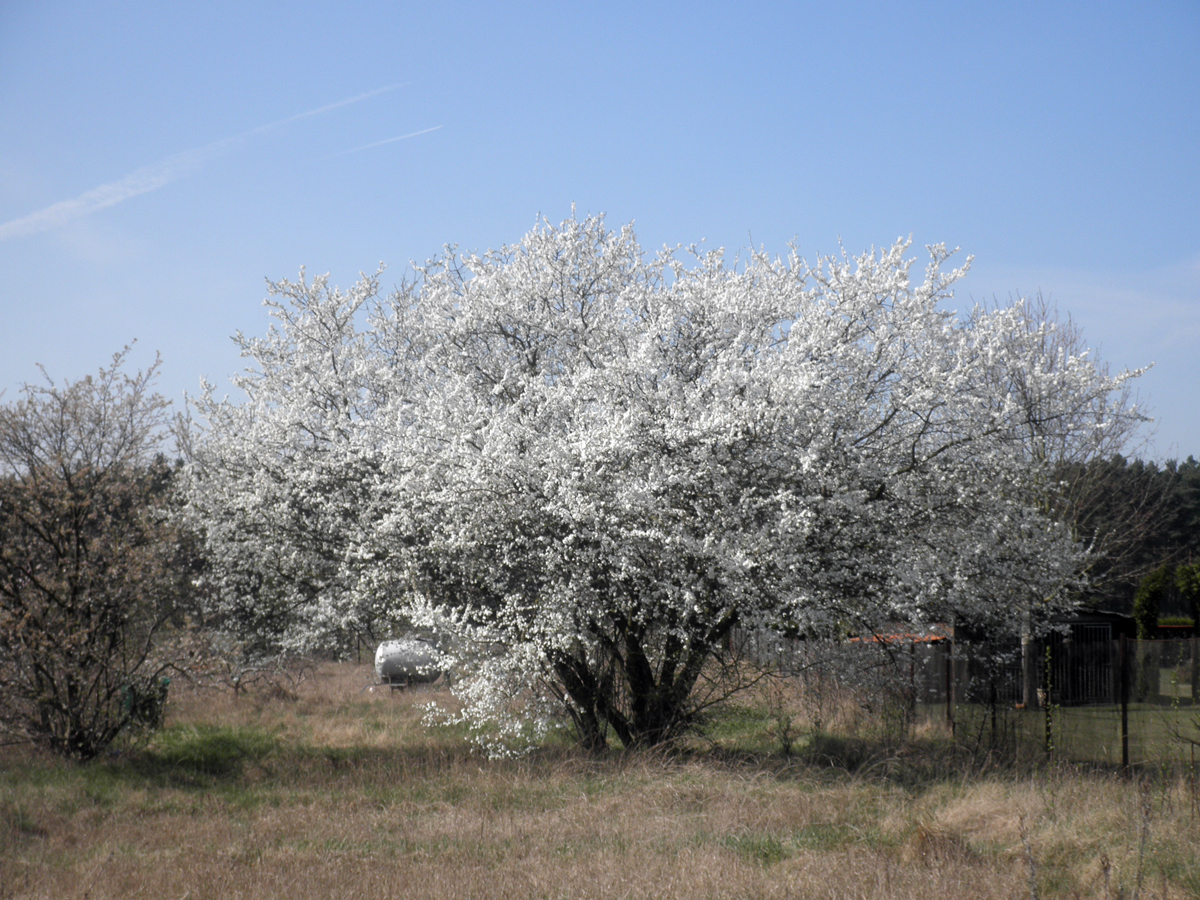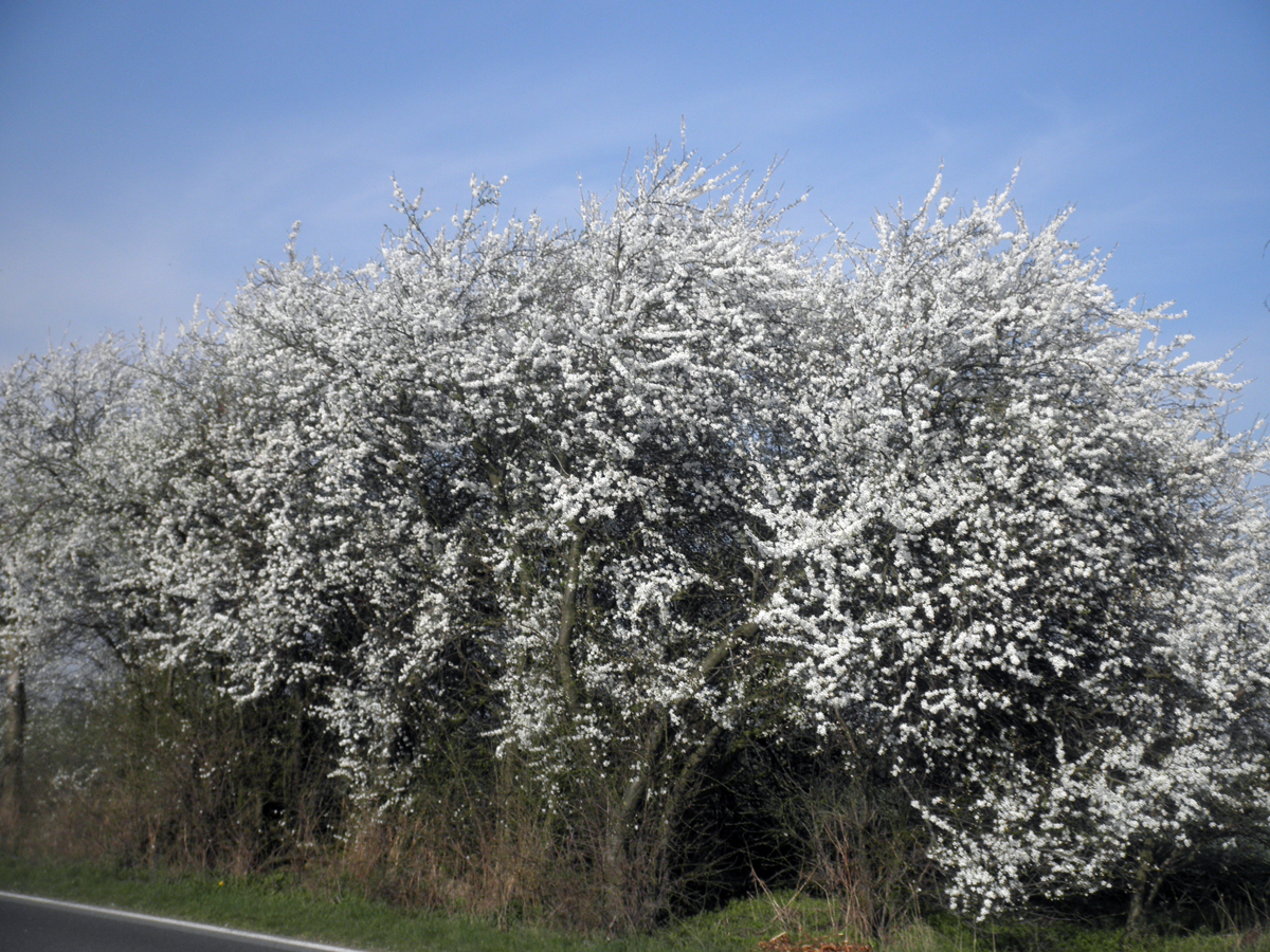 Weisse Baumblüten am Strassenrand und auf dem Feld sind Mirabellenbäume. Sie duften schwer süßlich wie betörend und ziehen bereits viele Bienen an.