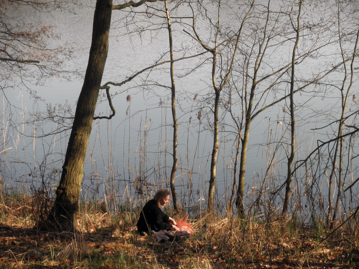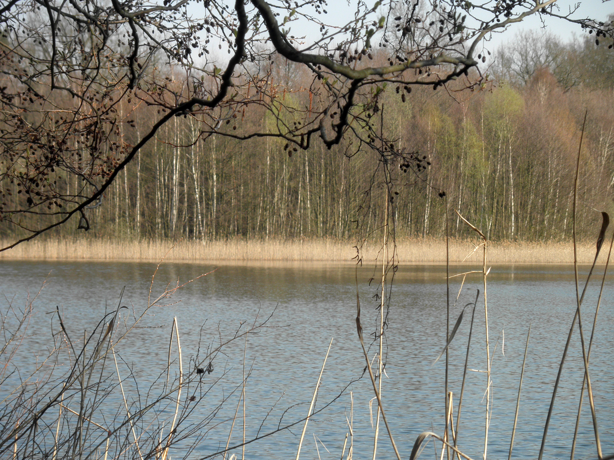 Wir nehmen Platz am Wasser des großen Lankesees und machen Mittag. Luft ist sehr mild und leicht diesig, halt Frühling. Hier am Wasser sind Waldwege unbefestigt. Aber man kann noch gut radeln, solange es trocken ist. Notfalls schieben.