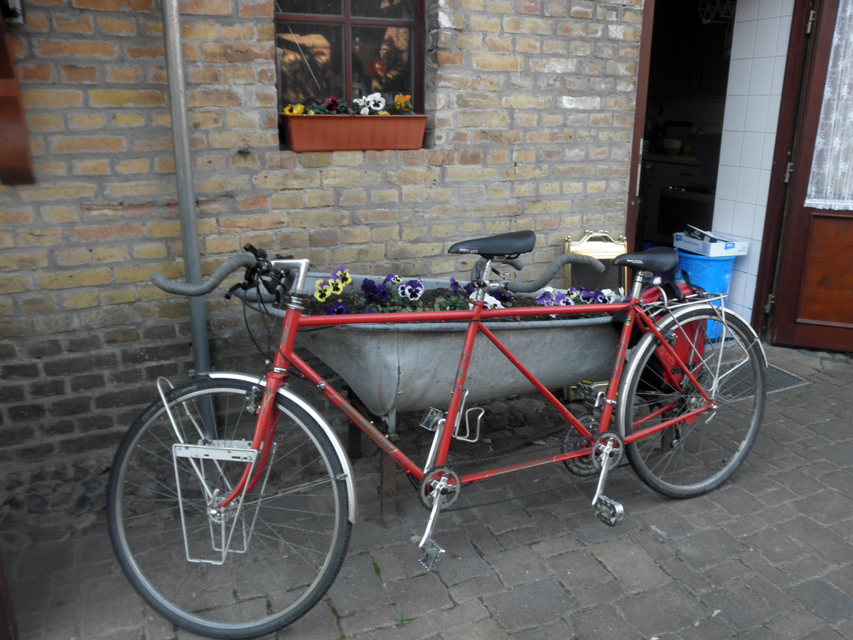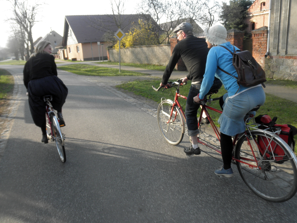 Und mir fiel ein Tandemrad sofort auf, dessen Besitzer auch hier Rast machte. Wir kamen mit ihnen, ein Künstlerpaar aus Bergsdorf, ins Gespräch und fuhren bis zum nächsten Dorf Meseberg zusammen. Wir durften ihr Tandam probieren! Ein tolles Teil, verlangt aber andere Aufmerksamkeit als normales Fahrrad. Es kann großen Spaß machen, auf einem Tandem zu reisen.