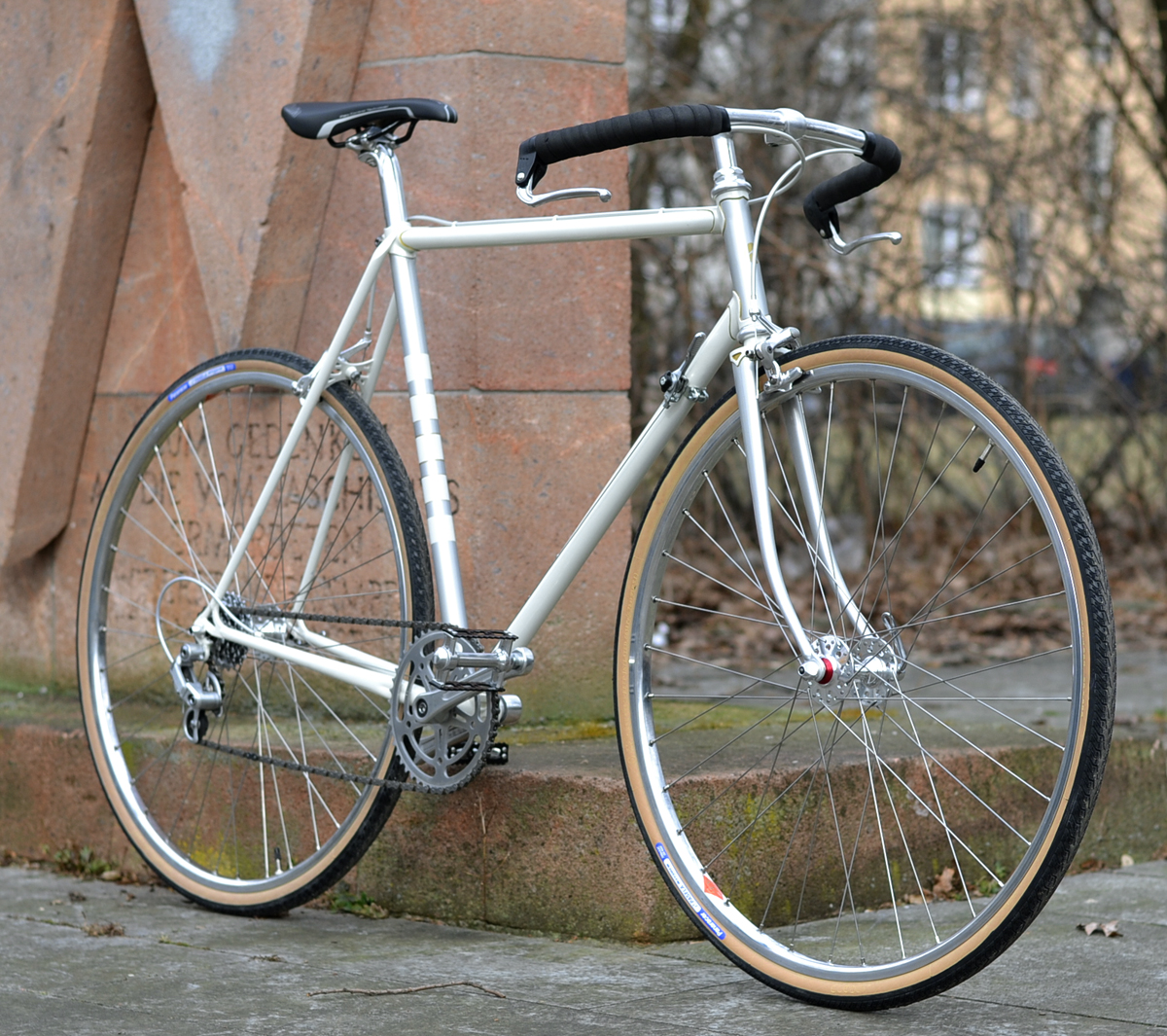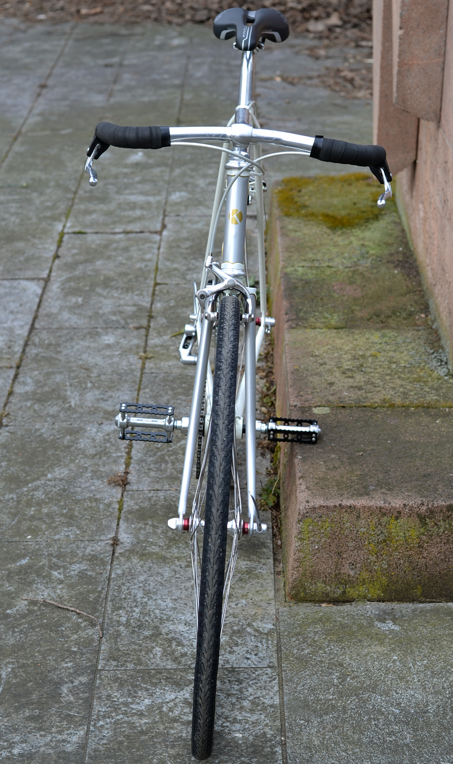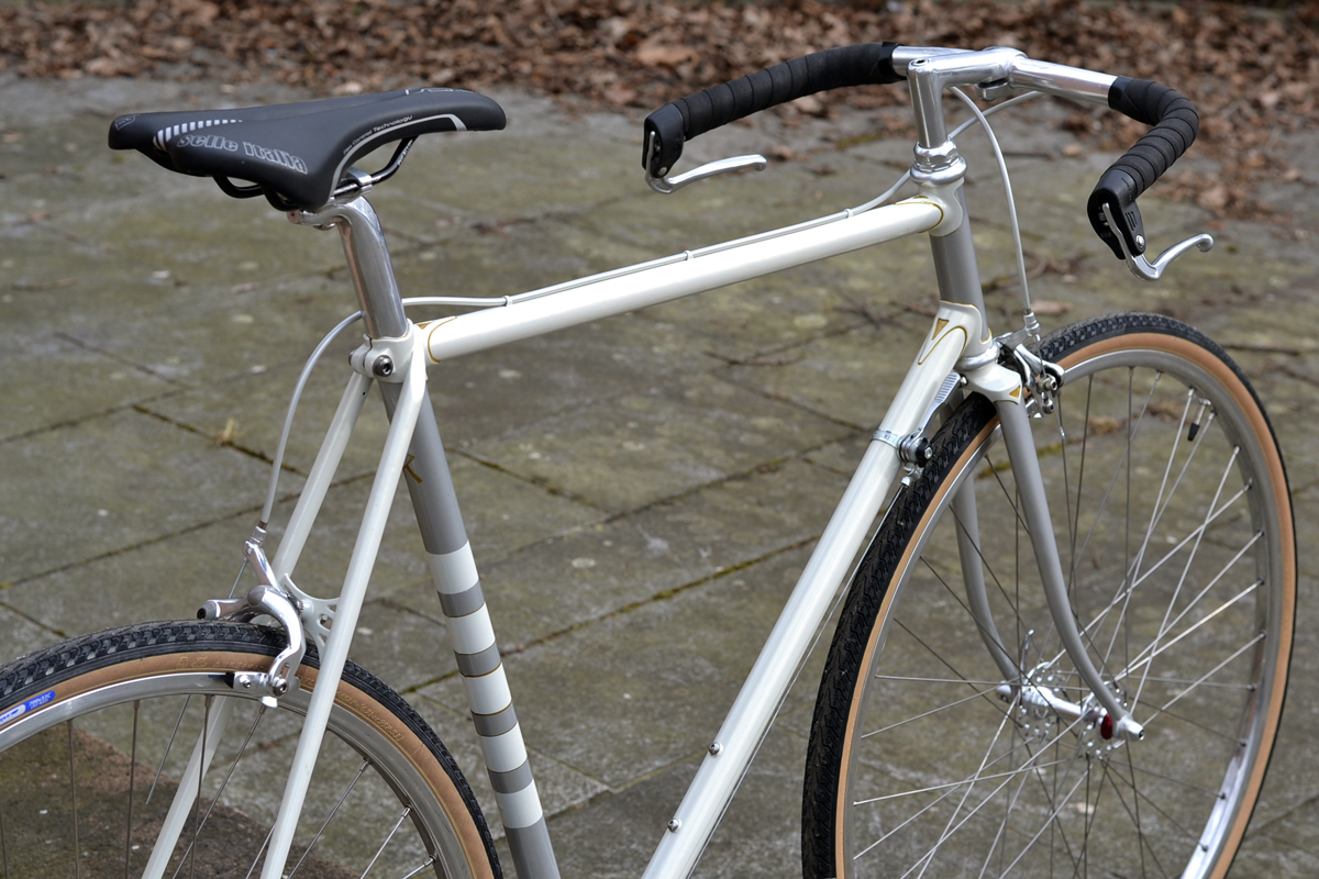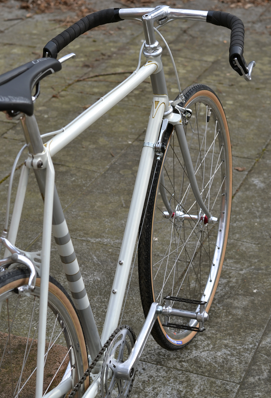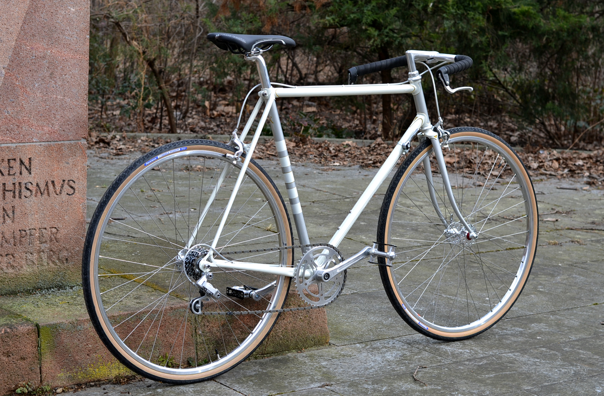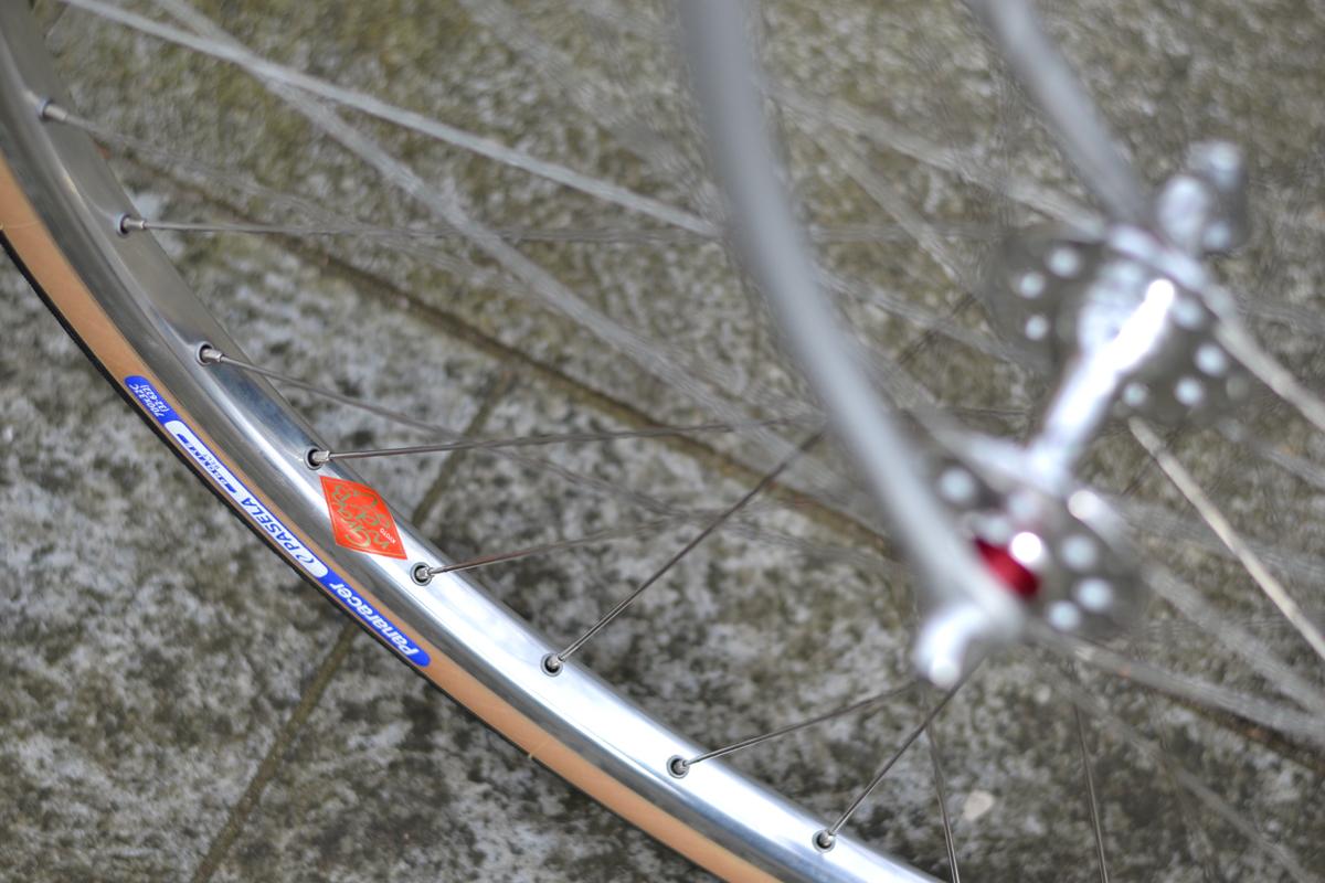 Auswahl von Teilen ist, wie so oft bei mir, ein totaler Mischmasch. Schwerpunkt diesmal ist Radsatz. Mit einem guten Rahmen(komplett Reynolds 531 butted) und gutem Radsatz hat man fast gewonnen. Rest ist, ganz grob gesagt, weniger wichtig. Felge wie Naben sind von Grandbois, Speichen sind Sapim Race, Reifen sind Panaracer Pacela 32mm(für mehr Komfort). Da der Hinterbau 120mm breit ist, habe ich aus 8-fache Cassette von Shimano eine 5-fache gemacht(mit extra Spacer). Dieser Radsatz ist nicht nur äußerlich klassisch elegant, sondern auch technisch sehr hochwertig.