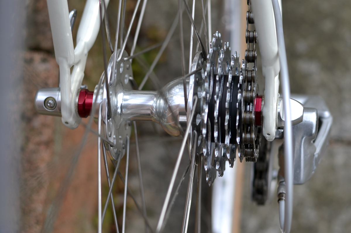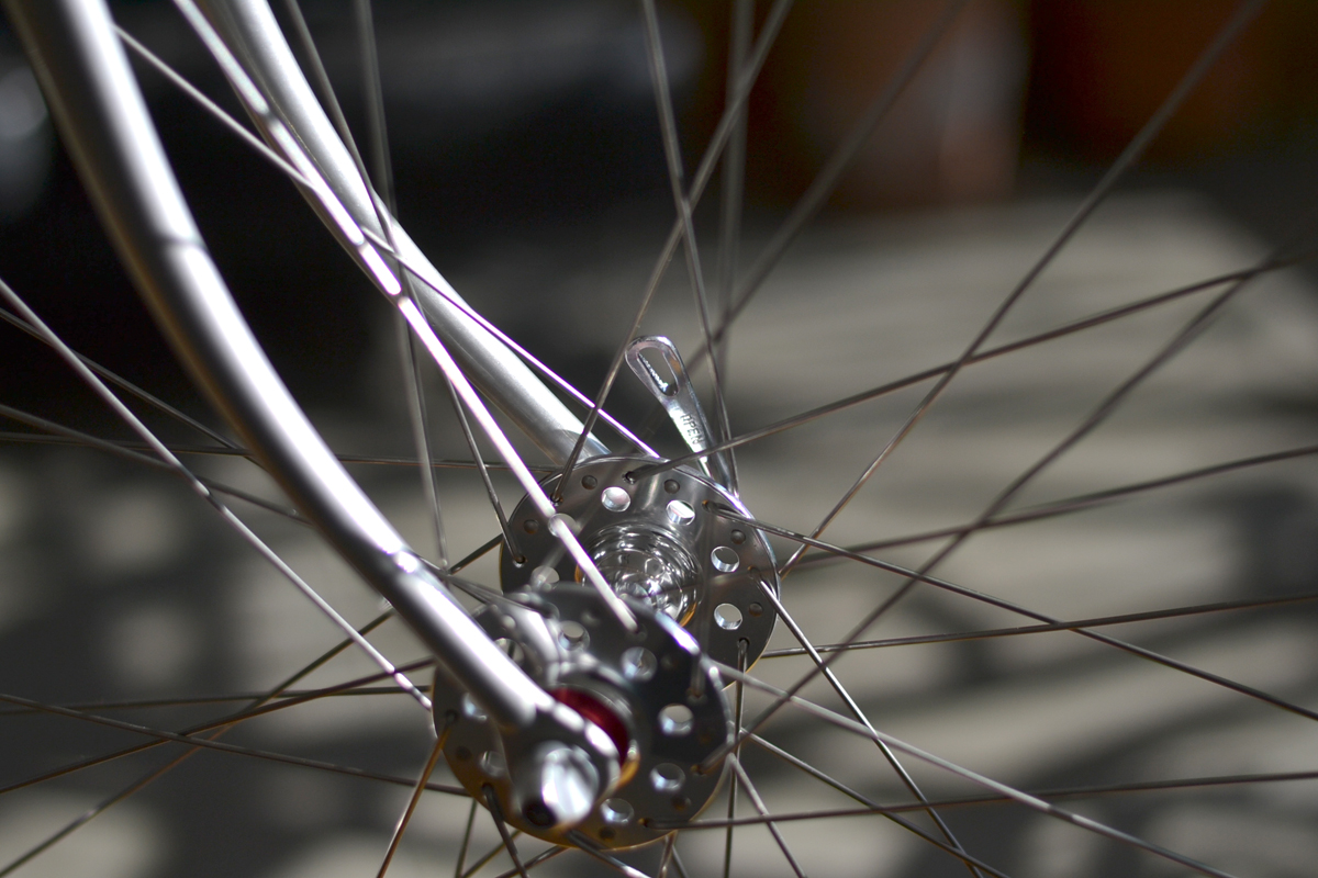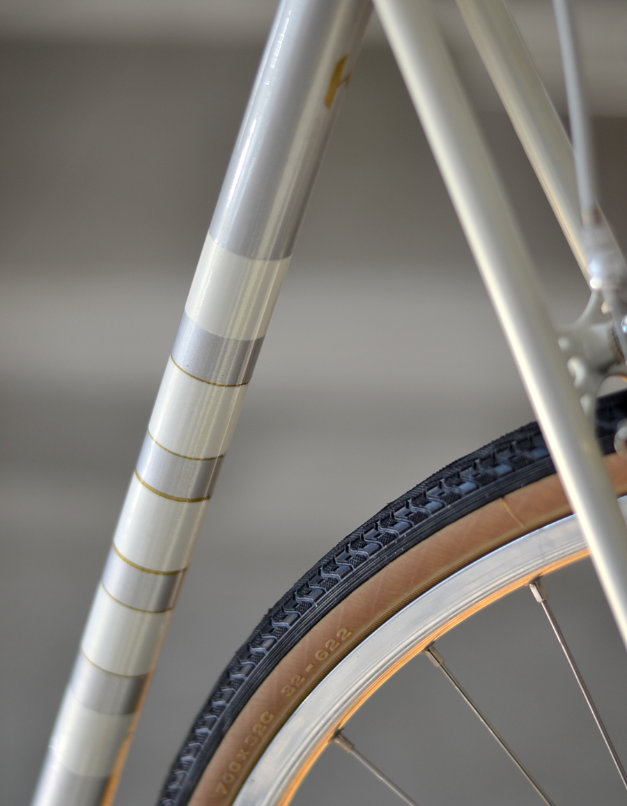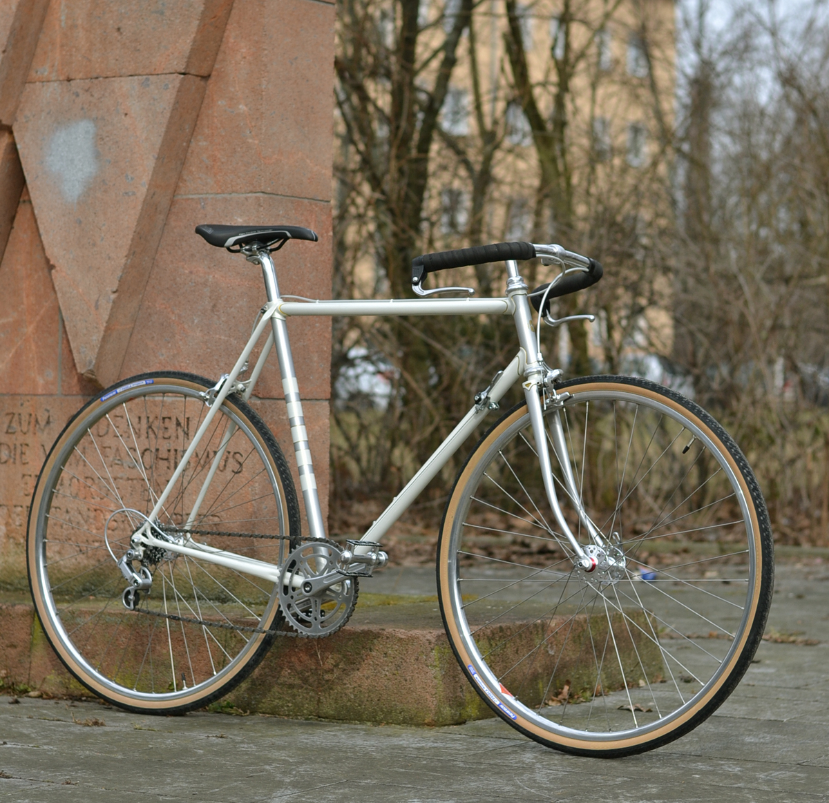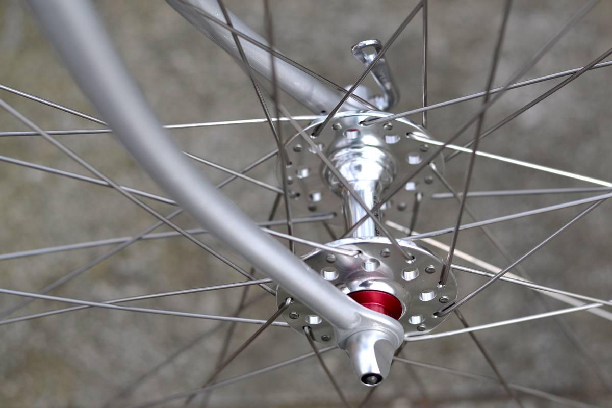 Auswahl von Teilen ist, wie so oft bei mir, ein totaler Mischmasch. Schwerpunkt diesmal ist Radsatz. Mit einem guten Rahmen(komplett Reynolds 531 butted) und gutem Radsatz hat man fast gewonnen. Rest ist, ganz grob gesagt, weniger wichtig. Felge wie Naben sind von Grandbois, Speichen sind Sapim Race, Reifen sind Panaracer Pacela 32mm(für mehr Komfort). Da der Hinterbau 120mm breit ist, habe ich aus 8-fache Cassette von Shimano eine 5-fache gemacht(mit extra Spacer). Dieser Radsatz ist nicht nur äußerlich klassisch elegant, sondern auch technisch sehr hochwertig.