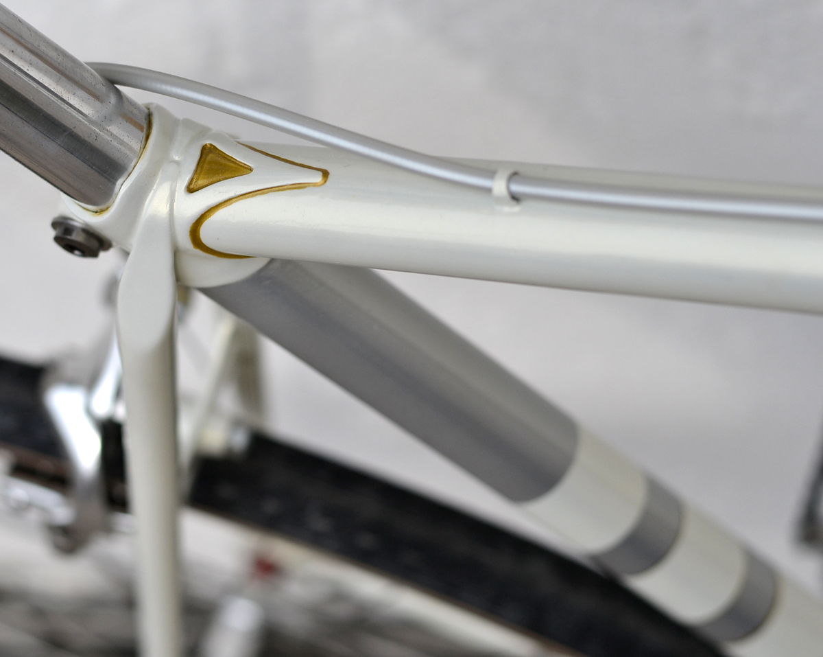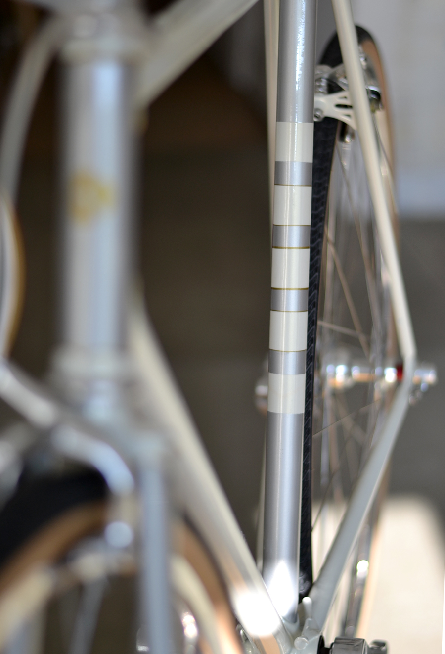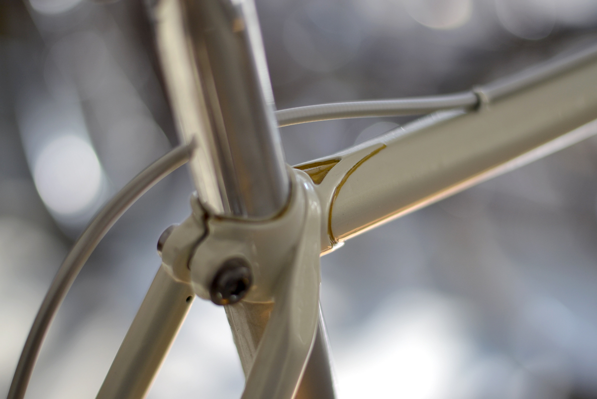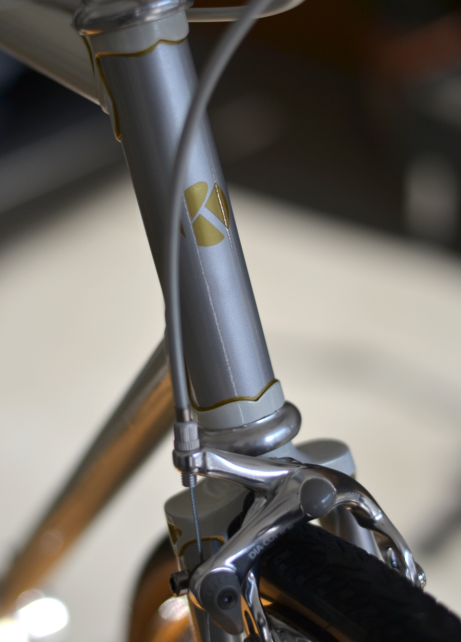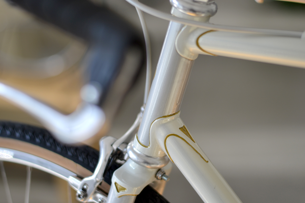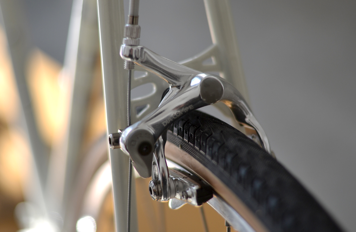 Auswahl von Teilen ist, wie so oft bei mir, ein totaler Mischmasch. Schwerpunkt diesmal ist Radsatz. Mit einem guten Rahmen(komplett Reynolds 531 butted) und gutem Radsatz hat man fast gewonnen. Rest ist, ganz grob gesagt, weniger wichtig. Felge wie Naben sind von Grandbois, Speichen sind Sapim Race, Reifen sind Panaracer Pacela 32mm(für mehr Komfort). Da der Hinterbau 120mm breit ist, habe ich aus 8-fache Cassette von Shimano eine 5-fache gemacht(mit extra Spacer). Dieser Radsatz ist nicht nur äußerlich klassisch elegant, sondern auch technisch sehr hochwertig.