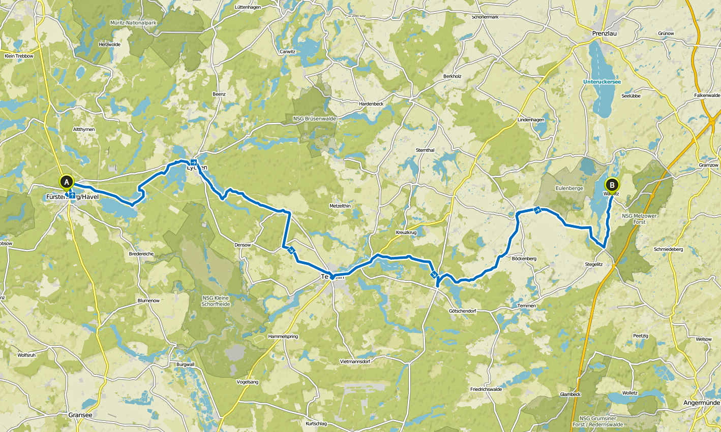 Diese Tour (ca. 78km) ist nicht für Rennrad. Die Route beinhaltet viele Waldwege mit losem Boden(22%). Einige Schtrassenabschnitte sind mit Kopfstein gepflastert(15%). Empfehlenswert ist Trekkingrad mit etwas breiterem Reifen oder Mountainbike. Uckermark geniessen bedeutet auch fast automatisch, viele Auf- und Abfahrten(diesmal je 400m) geniessen. Sie sind zwar alle kurz, aber erfordern eine gute Kondition. Aber über die Hälfte sind Radwege. Viele Strassen sind ziemlich leer. Für Rennrad oder schnellere Tour sollte man Waldwege meiden und ruhige Strassen suchen.