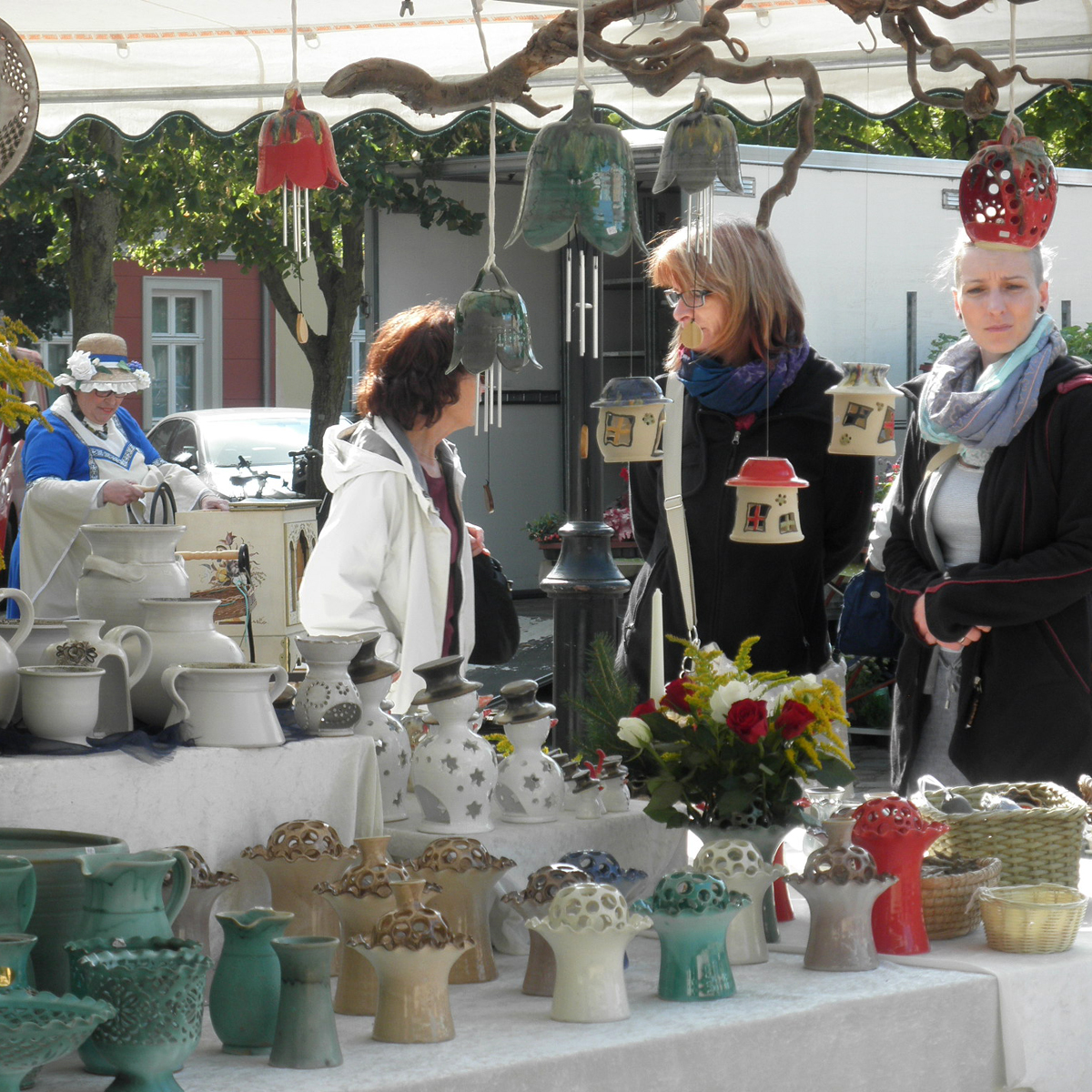 Templin ist eine für uckermärkisches Verhältnis gut gehende Stadt. Toll ist komplett erhaltene mittelarlterliche Stadtmauer aus Feldstein und Stadttoren aus Backstein. Innenstadt ist, wie so oft, weil mittelalterlicher Stadtkern durch Brand verlorenging, Barock aufgebaut und hat auch viele hübsche alte Häuser. Auf dem Markt war gerade jährlicher Töpfermarkt und sehr belebt. Hier haben wir uns mit Kaffee und Waffel (wer hat noch Würstchen gegessen!?) gestärkt, schauten die Stadt ein wenig und fuhren weiter.