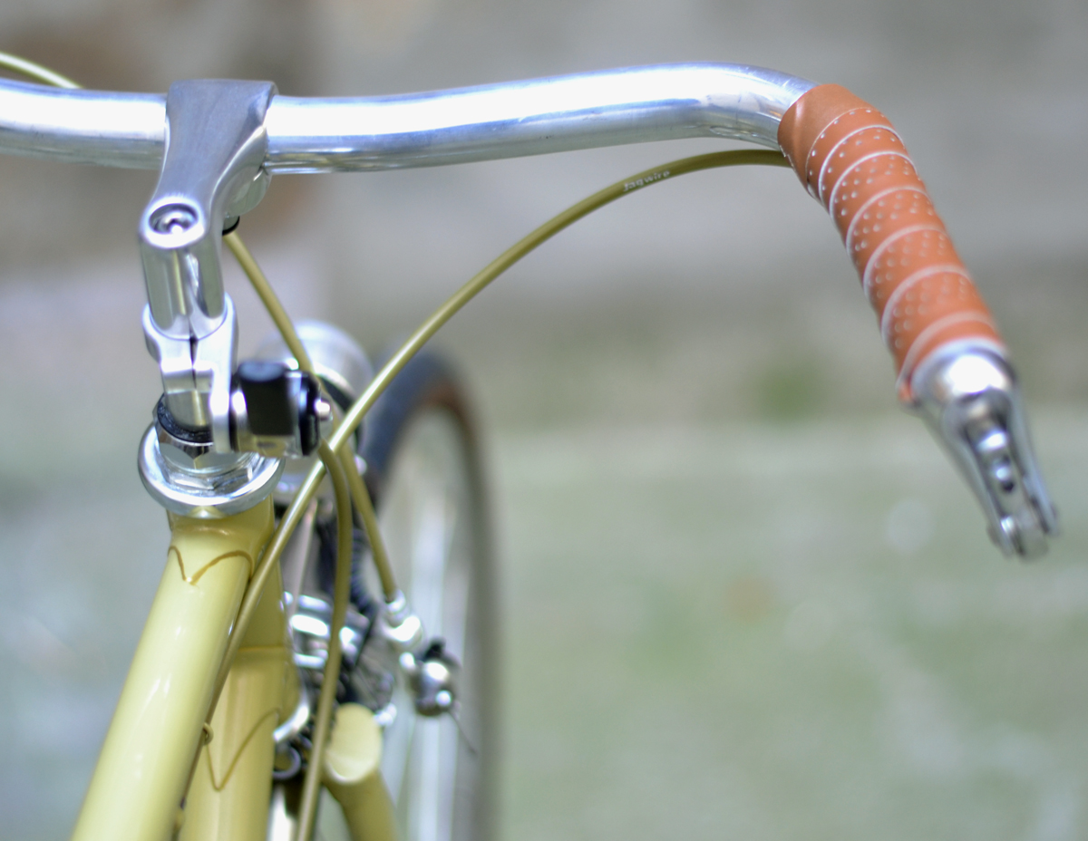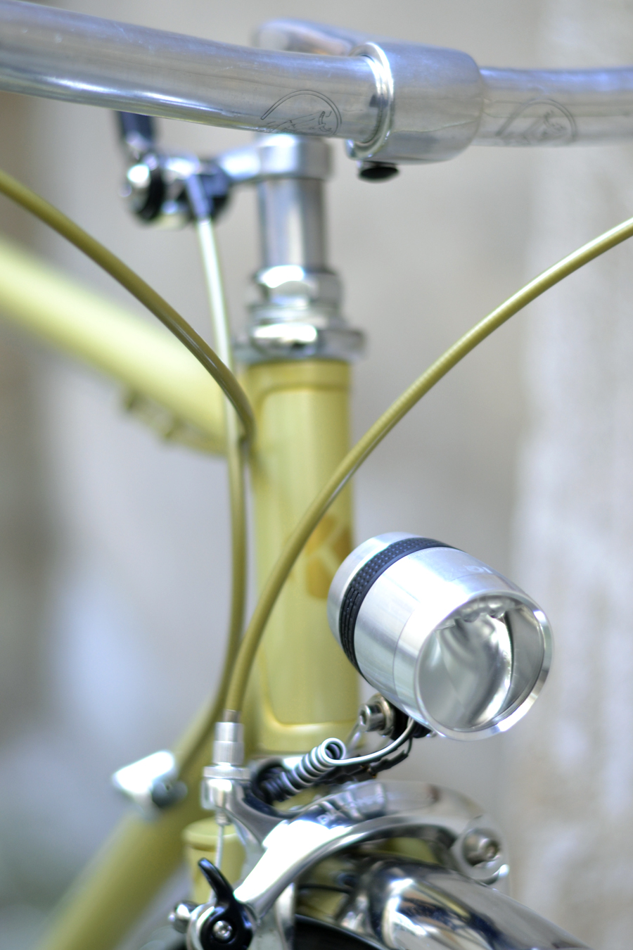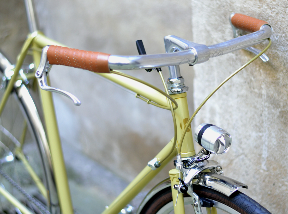 Die neue Lampe von B&M ist extrem hell. Es sieht auch gut aus. Nicht zuviel Design, gerade noch. Sattel und Lenkerband sind aus Kunstleder, so sind sie Pflgeleicht. 9-fache Schaltung(46 x 11/28) müßte für Flachland für allemal reichen. Conti Grandprix 4 Seasons in 32mm ist eine gute Wahl, schön und stadttauglich. Wunderschönen Inverse-Bremshebel von SOMA habe ich für den schönen Rahmen gegönnt.