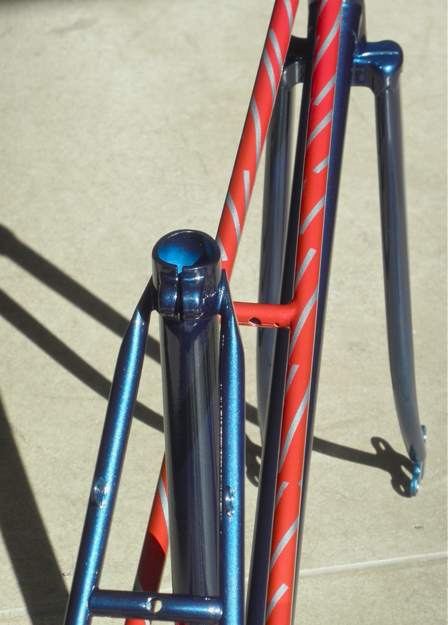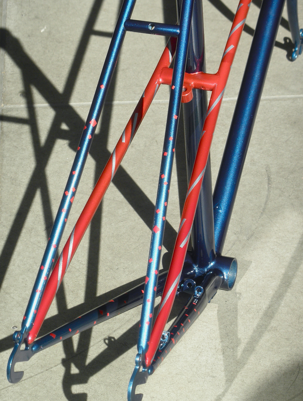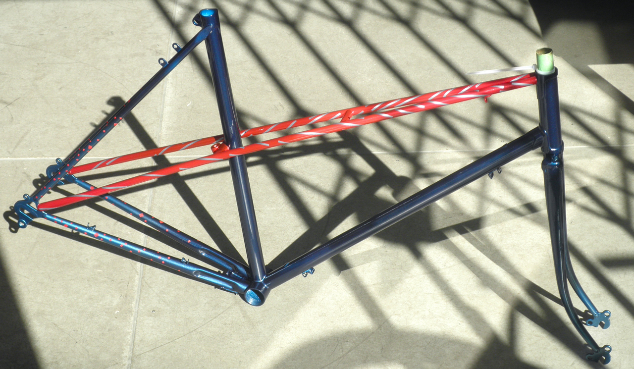 Wieder ein Farbversuch. Ich dachte an eine versteckte französische Tricolore, blau/weiss/rot, denn das ist ein Motobecane-Rrahmen.