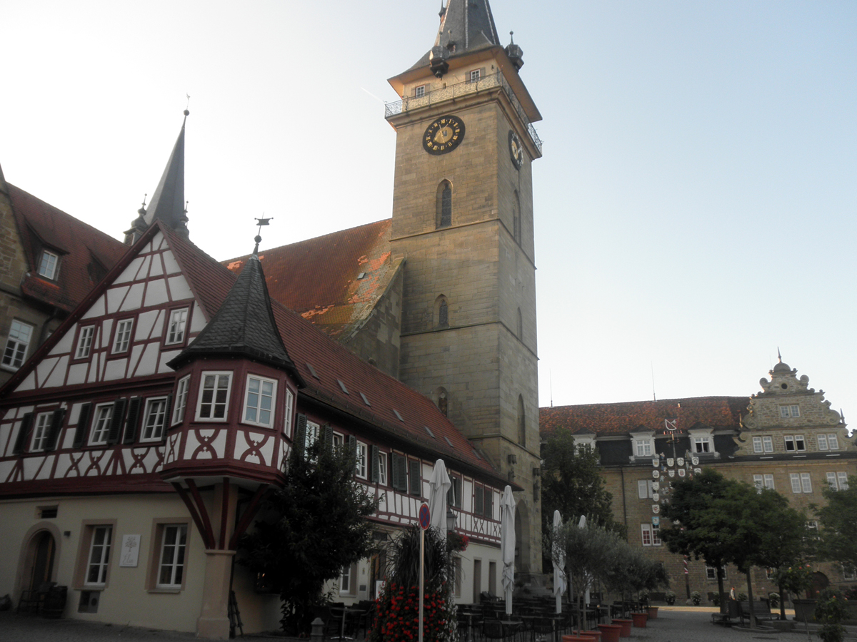 Der Tag ist bereits kürzer geworden. Erst gegen 06:30 geht die Sonne auf. Wetterbericht sagt einen heissen Tag voraus. Ich möchte früh starten und ans Ziel kommen. Tram-S-Bahn fährt wacker mit hohem Tempo(etwa 100?). In Heilbronn hat die Strecke Strassenbahncharakter. Danach fährt der Zug wieder als Überlandbahn. Öhringen, 07:30. Die Stadt ist noch nicht ganz wach. Im alten Stadtkern sind viele intererssante Bauten vorhanden.