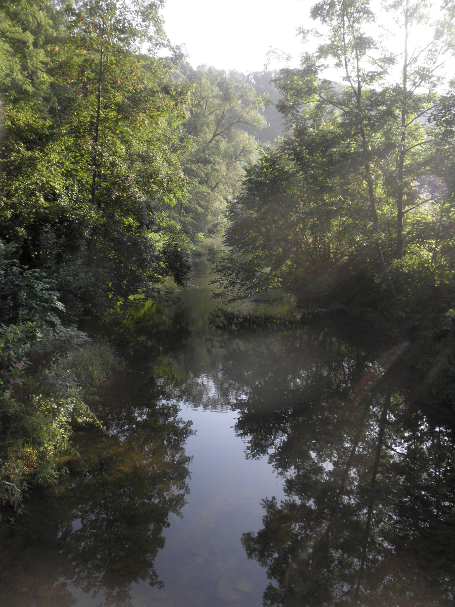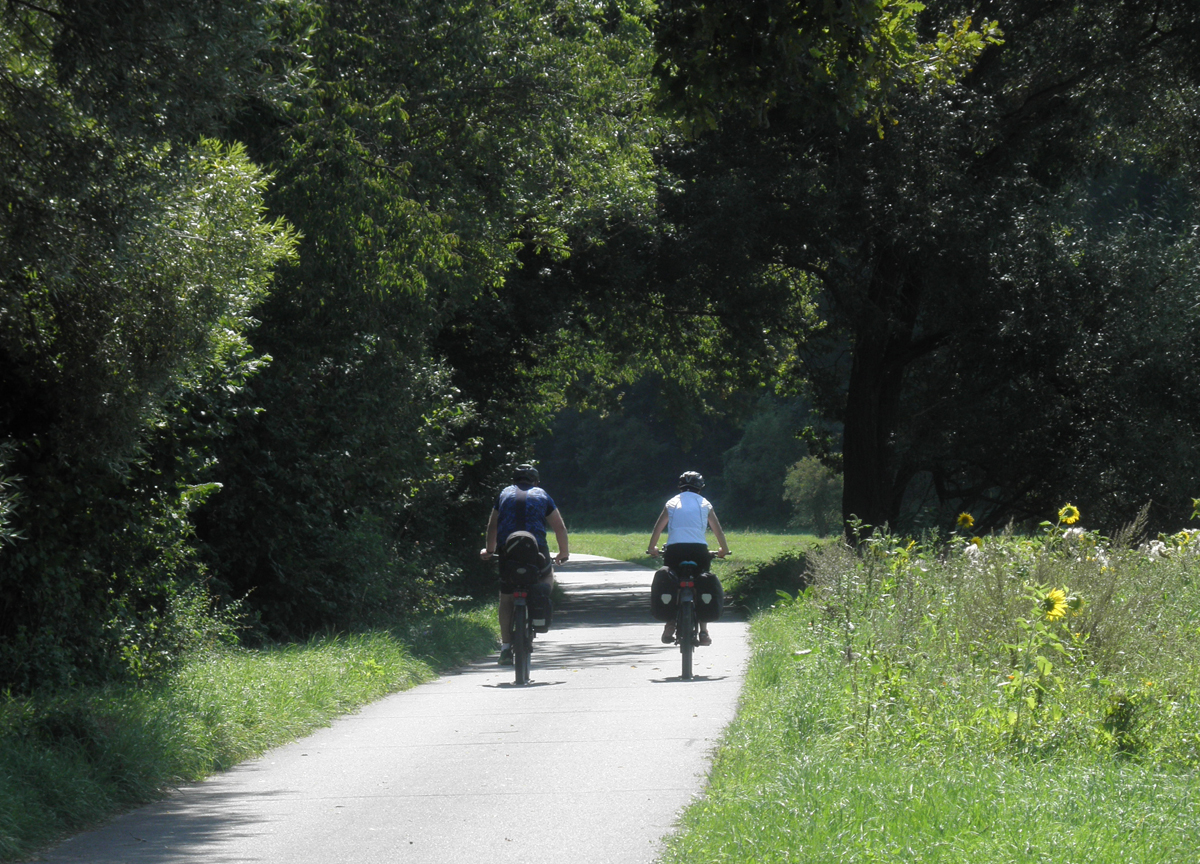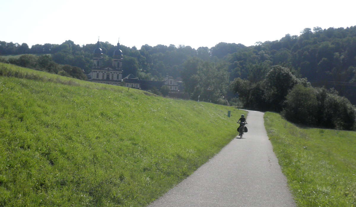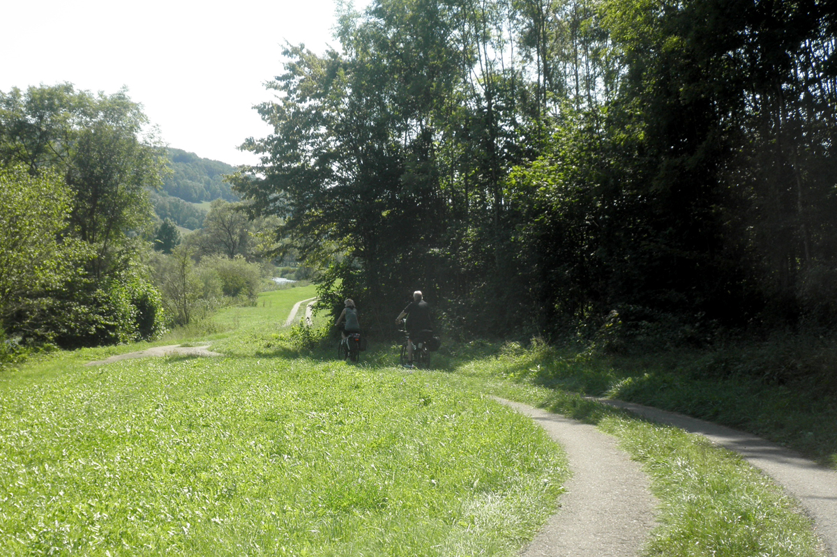 Langsam wird der Tal oft enger und der Radweg auch etwas welliger. Es wird nicht langweilig hier. Und ich sehe einige Radfahrer mehr, aber immer noch recht wenig. So etwa einen Radfahrer/eine Radlergruppe pro halbe Stunde,, Es ist doch noch Ferienzeit hier im Süden. Natürlich ist es angenehm für mich, viel besser als volle Radwege wie an der Elbe.