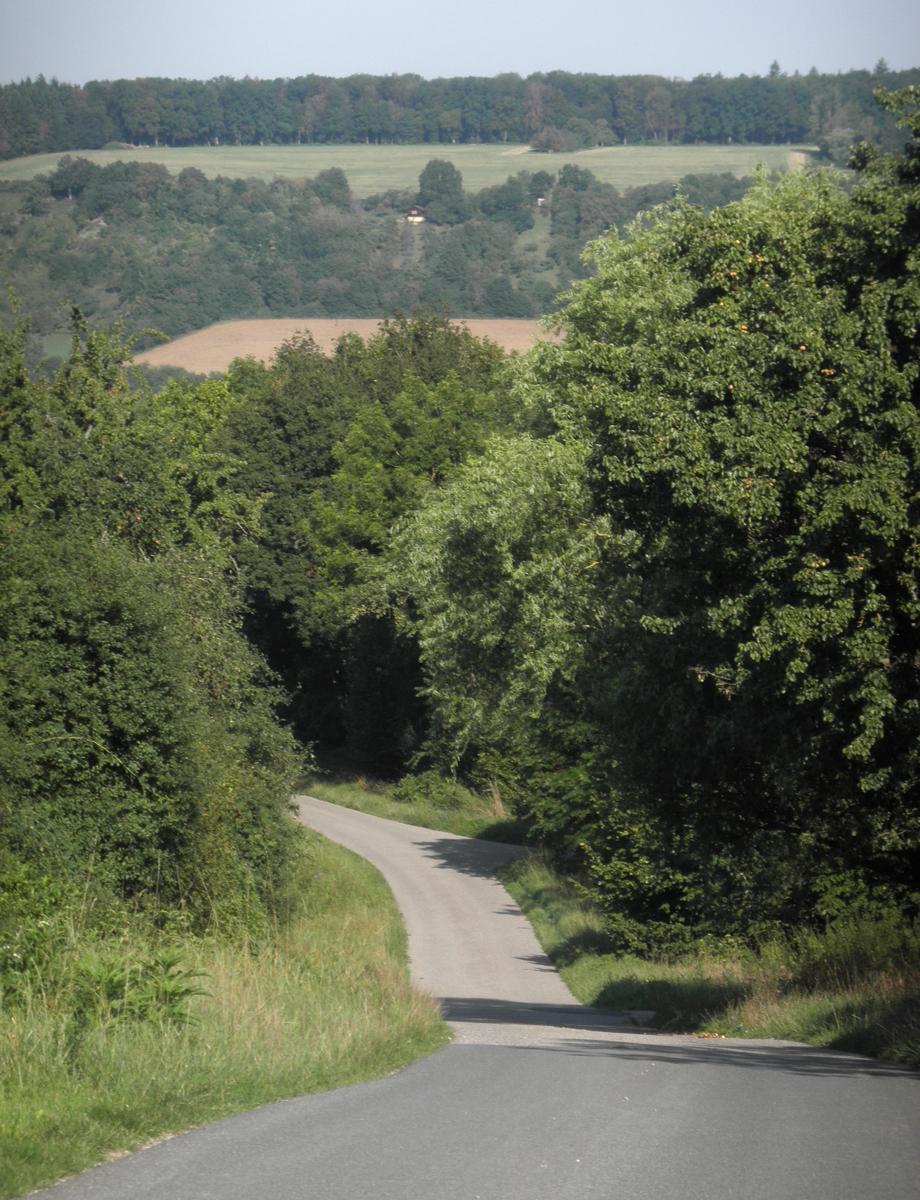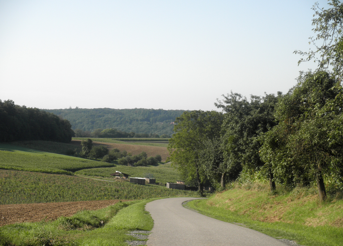 Ab Sindringen verlasse ich Kocher und fahre die Querverbindung zu Jagsthausen, d.h. in 6km 150m hoch und wieder soviel unter. Das ist gefühlt 8%(ich weiss nicht, wie steil es wirklich ist) Steigung und Abfall. Das geht noch gut. Oben auf dem Kamm knallt die Sonne schon. (das erste Foto unten ist rückblickend,,)