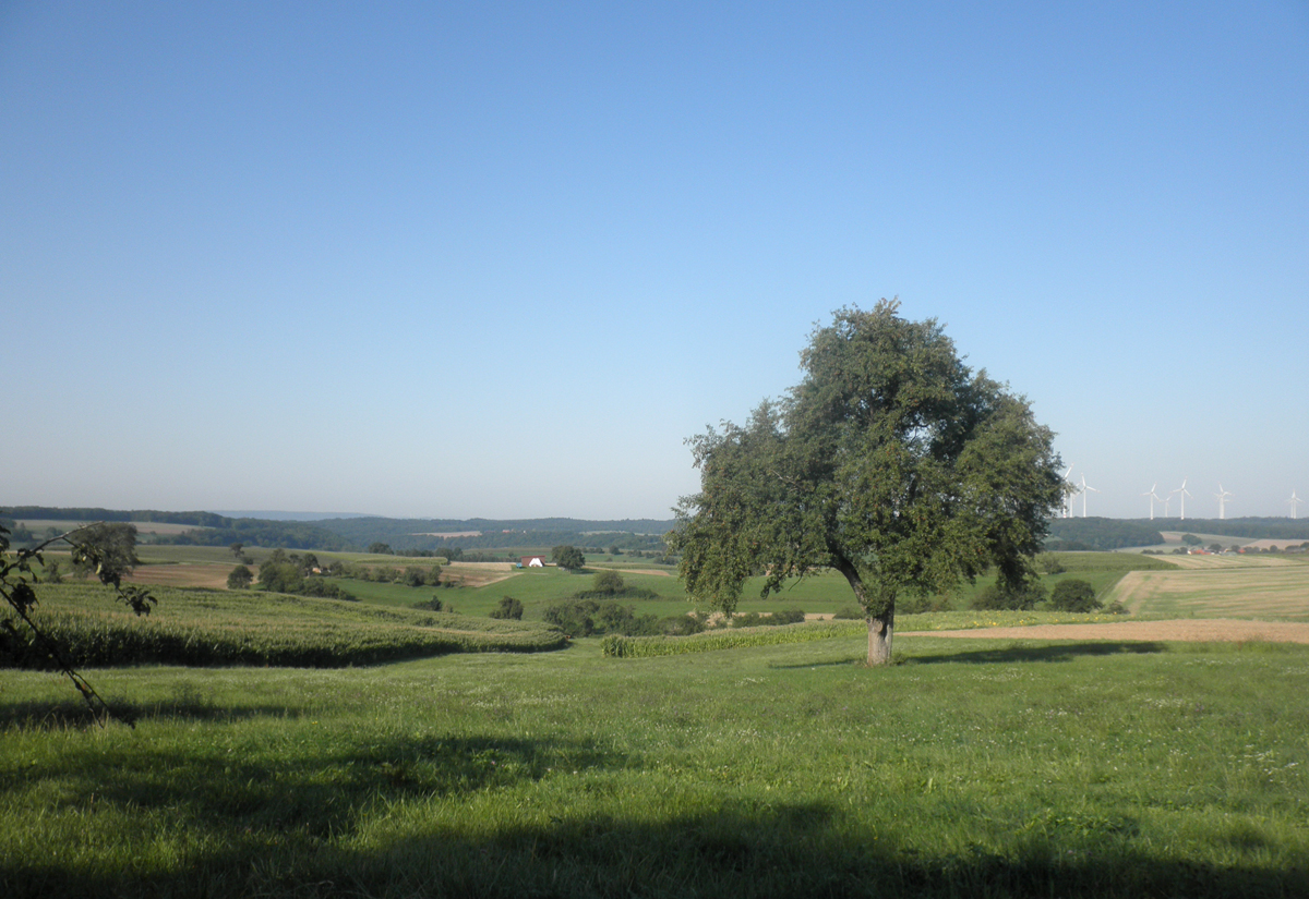HIer oben klaue ich 2 Äpfel vom Baum und geniesse den weiten Blick bis Widdern, wo die Autobahn die Jagst überquert. Dann sause geschwind unter bis Flußebene.