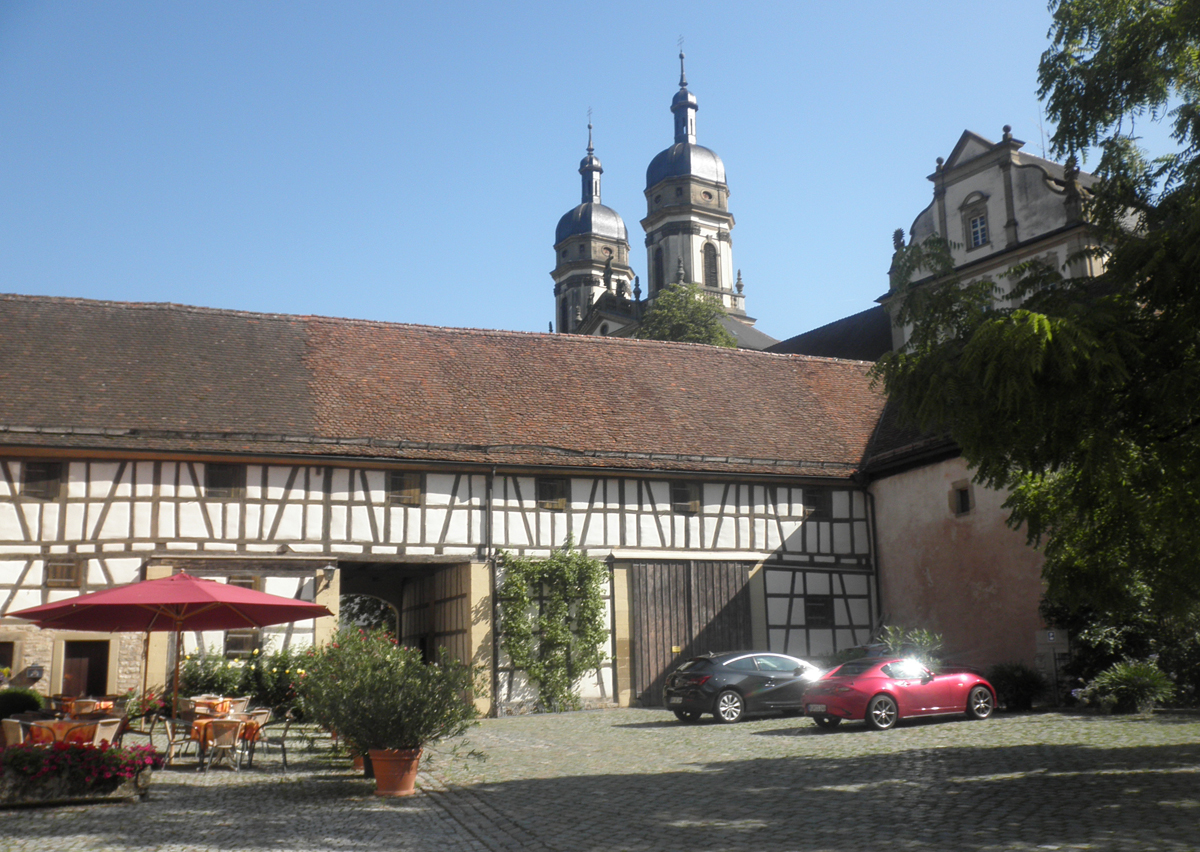 Gleich kommt Kloster Schöntal. Er ist prächtig und wirkt auch mächtig. Wie wichtig Kloster war, als Zentrum des Wissens, der Technik und der Macht, spürt man deutlich. Hier gibt es im Sommer, als Teil von Hohenloher Kultursommer, viele Konzerte. Es ist noch Vormittag. Gerade wird ein Violinstück geübt. Ich setze mich ins Kloster-Café, nehme eine Tasse Kaffee und Walnußtaler. Es gibt große Kuchenauswahl hier, vorbereitet für den Besucherdrang am Nachmittag. Oleander und andere blühen im Innenhof. Nur ein Paar Radtouristen, sonst sehr ruhig.