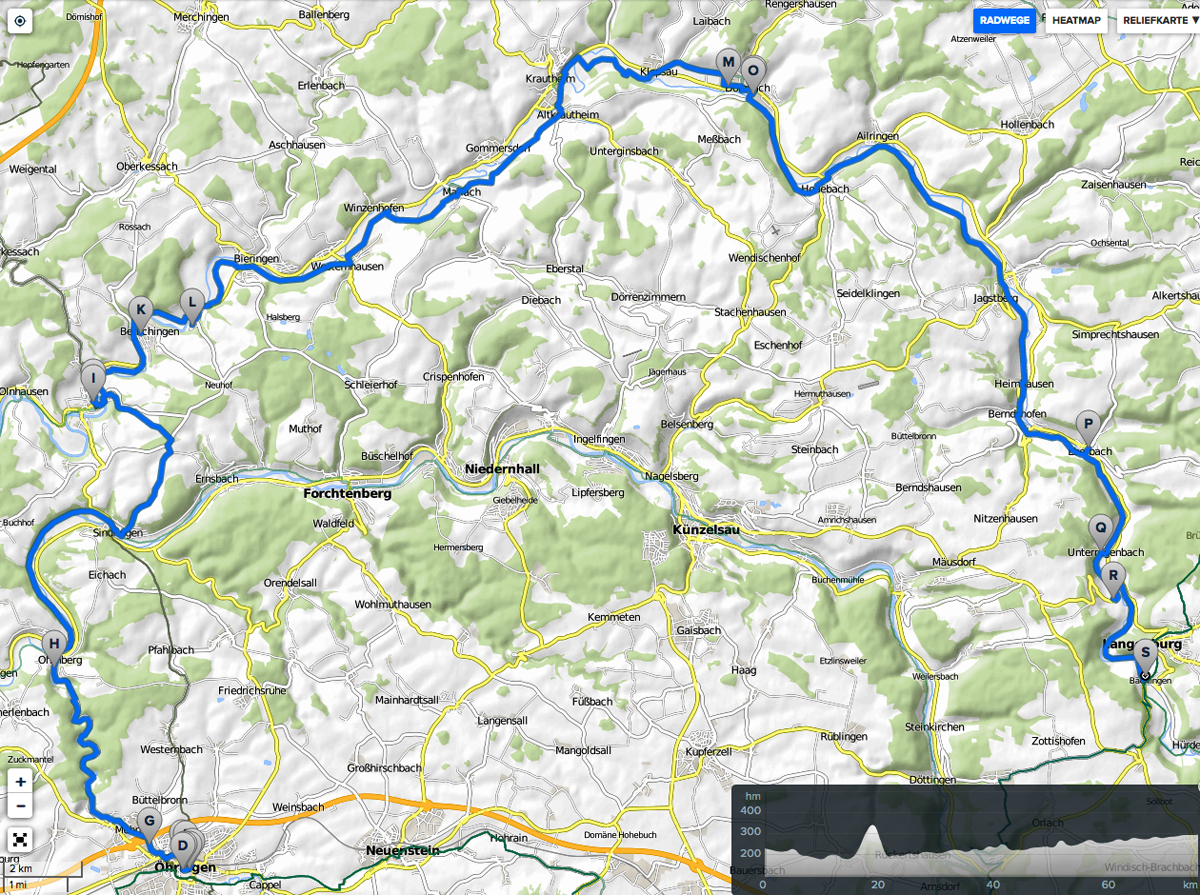 Für Sommerpause fahre ich nach Hohenlohe. Von Berlin aus war das eine lange Reise mit der Bahn. Nun, aus Karlsruhe könnte man ganze Strecke mit dem Rad fahren. Die kürzeste Strecke wäre weniger als 140km. Ich bin aber müde von der Arbeit,, So dachte ich, ich fahre die halbe Strecke mit der Bahn, dann radle ich den Rest. Ich schaue die Karte und Bahnanbindungen. Ich lasse Kraichgau links liegen, steige Heilbronn oder Öhringen aus. Wenn radeln, dann schöne Route. Das wäre freilich Kocher-Jagst-Radweg. Von Heilbronn aus könnte man fast ganze Zeit Flüsse entlang radeln. Das bedeutet, es ist fast immer angenehm flach. Von Öhringen aus muß man erst zum Kocher, dann zur Jagst eine Querverbindung fahren. Das bedeutet eine ziemlich steile auf und ab. Nach Überlegung mache ich die Route fest. Ich möchte Öhringen anschauen, deshalb von dort losradeln. S4 fährt auch bis Öhringen. 5:30 Karlsruhe Hbf. ab ist auch eine gute Zeit. Dann entlang Flüßchen Ohrn bis Ohrnberg, von dort entlang Kocher bis Sindringen, dann hoch hinauf und hinunter zu Jagsthausen. Danach immer Jagst entlang bis Langenburg/Bächlingen. Mit Orte Anschauen knapp 80km, gut überschaubare Strecke. Es geht los.