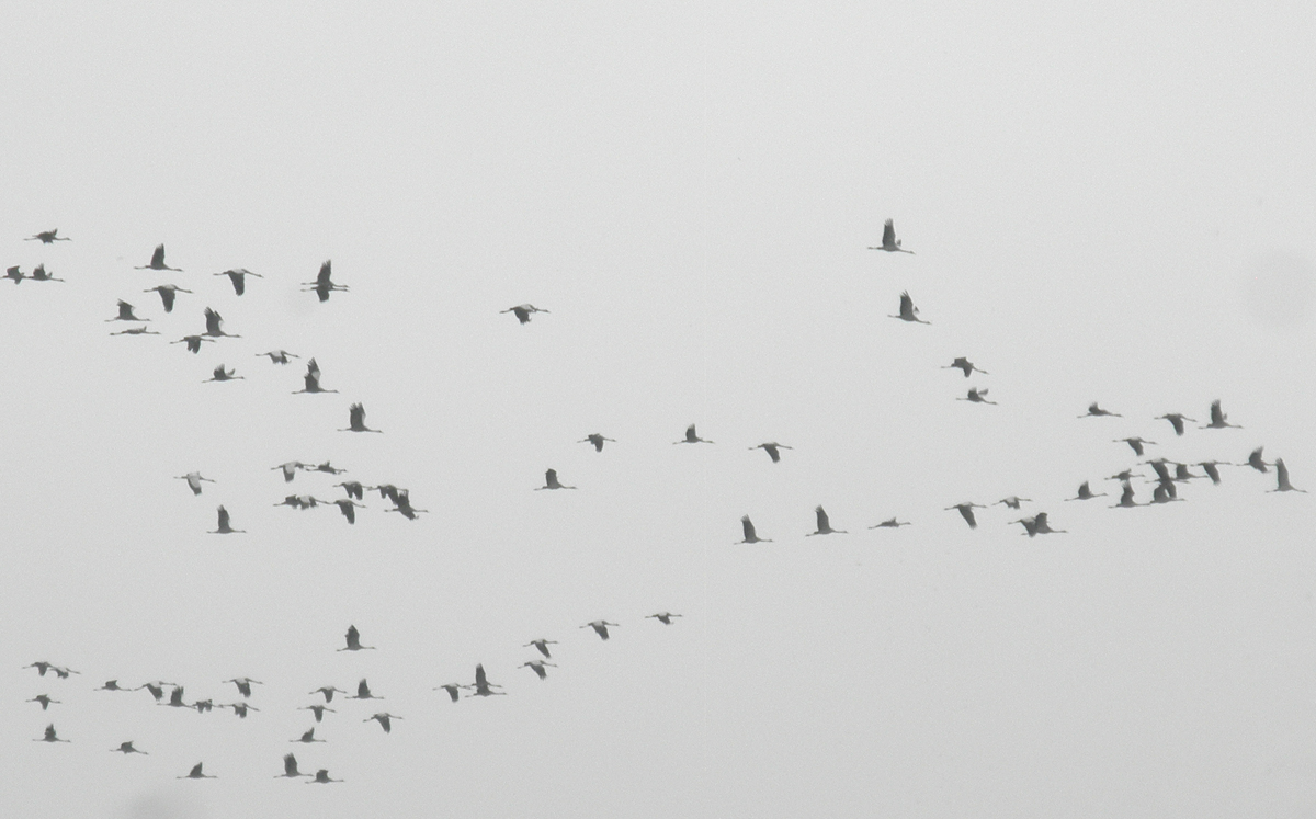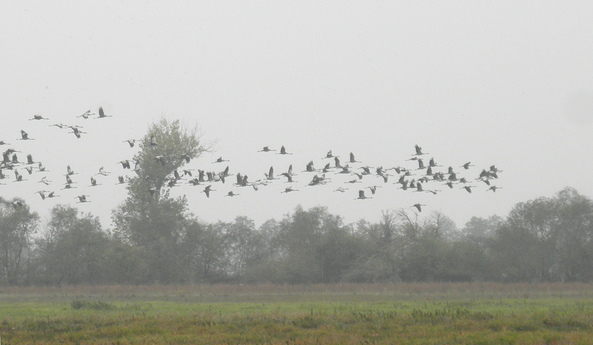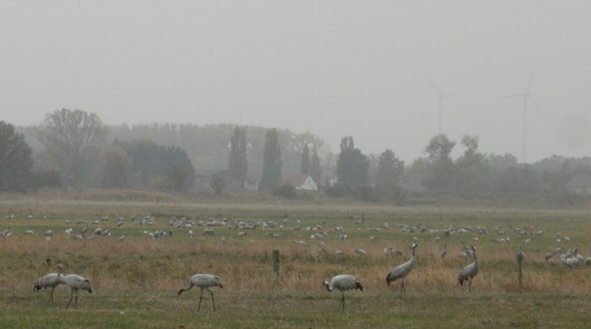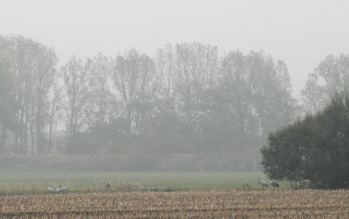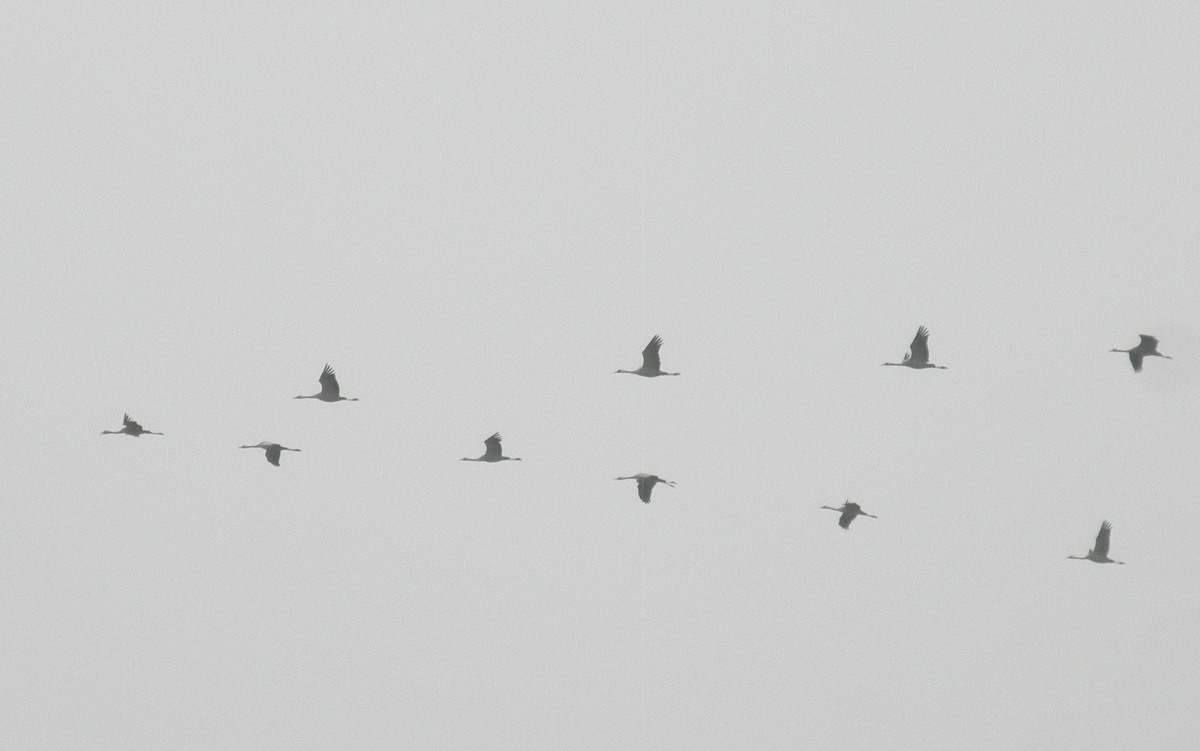 Immer wieder treffe ich die Kraniche auf Felder. Manche fliegen knapp über mich. Ihre Gesänge hallen trotz neblig feuchter Luft.