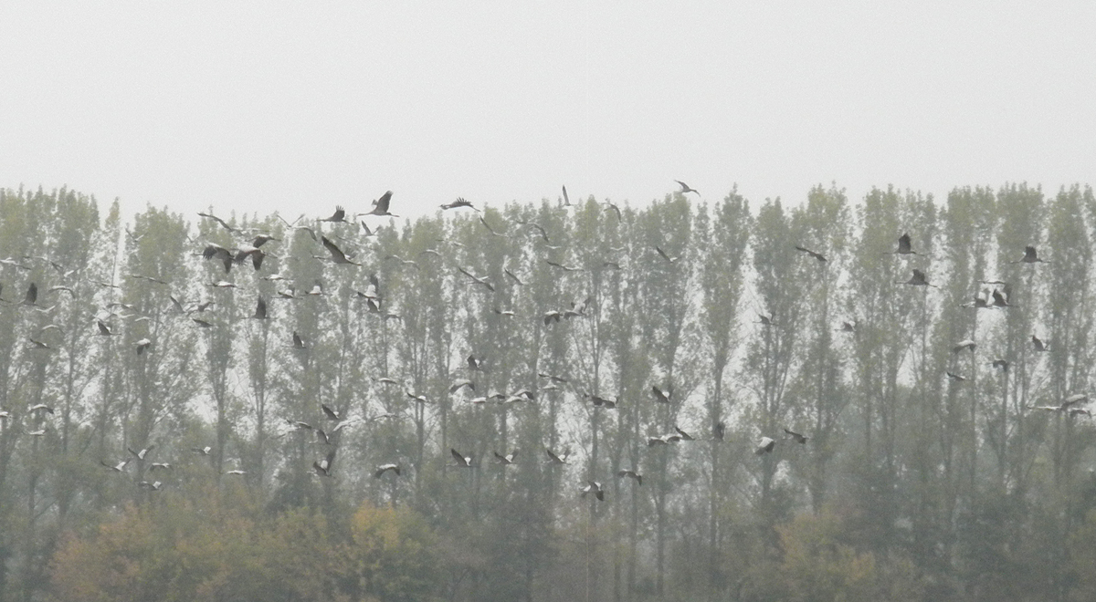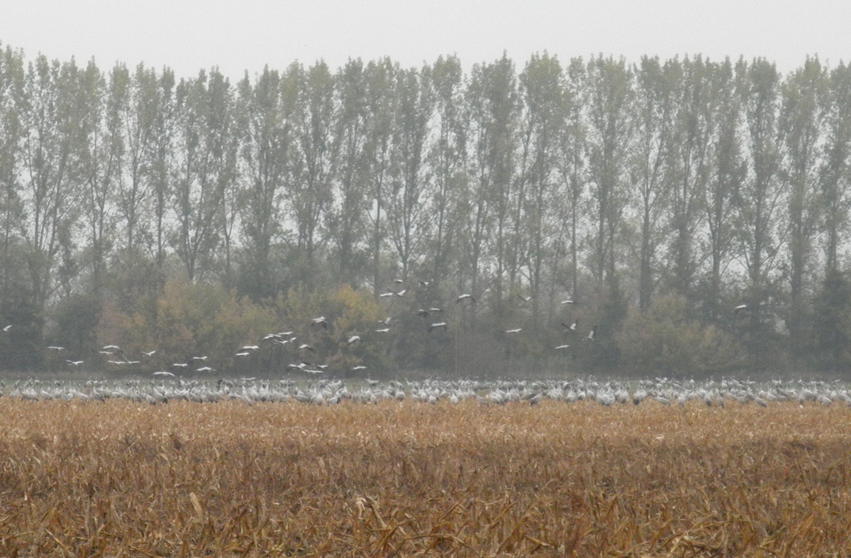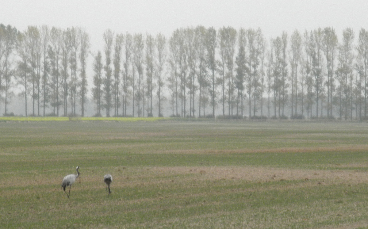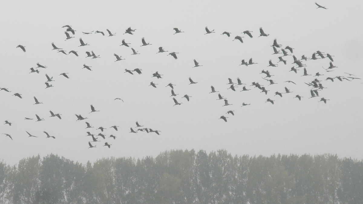Immer wieder treffe ich die Kraniche auf Felder. Manche fliegen knapp über mich. Ihre Gesänge hallen trotz neblig feuchter Luft.