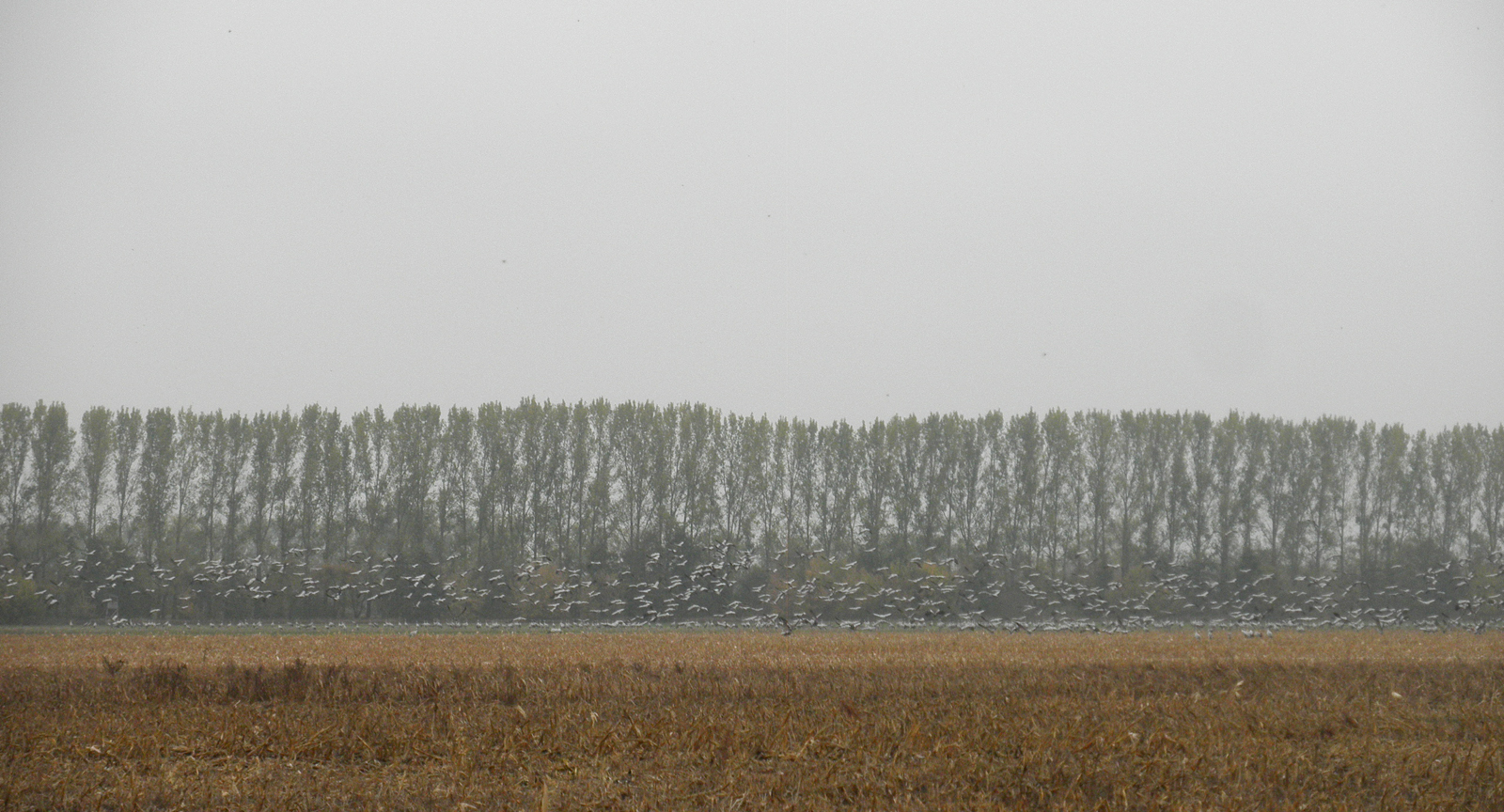Überall auf den Felder sind sie. Manchmal zu nah dran(100m Abstand ist nicht genug), so daß sie wegen mir unruhig werden. Ich mache mich möglichst klein und still, aber sie riechen den Menschen, je nach der Windlage, vom Weiten. Dann fliegen sie ab. Das sollte nicht sein, denn sie verbrauchen unnötig Energie. Ich sage ganz leise, „Bleibe ruhig und friss weiter“, aber sie haben große Angst vor Menschen, komischerweise gar nicht vor trekker oder Züge. Ich sage wieder leise „Sorry!“, aber schaue ich wie sie fliegen.