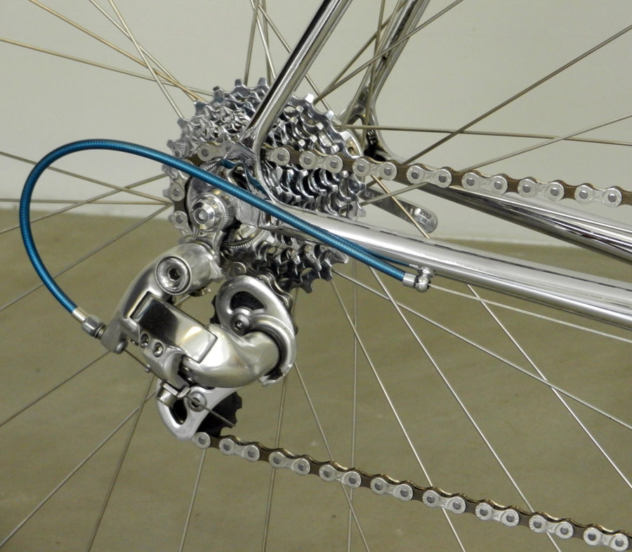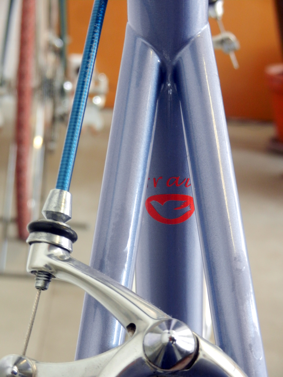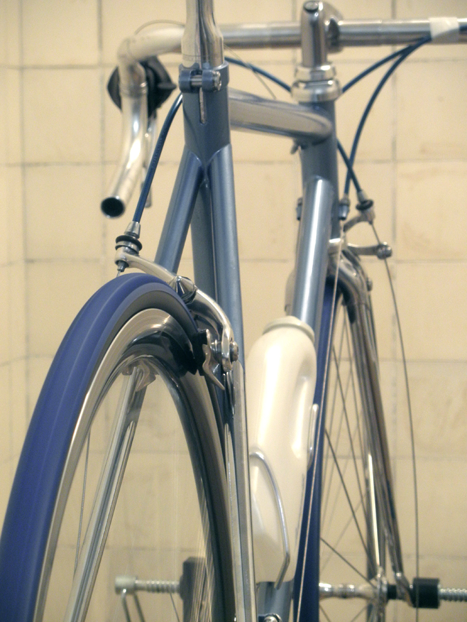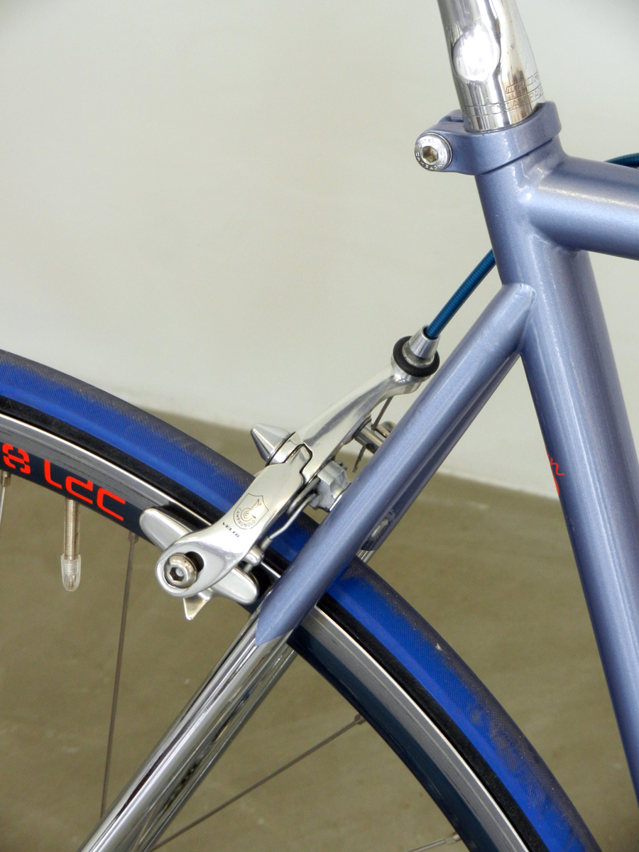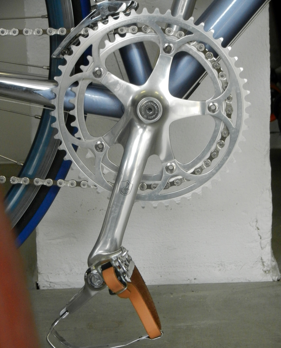 So fing ich an, über neue Grafik nachzudenken. Ich hatte Rigida DP18 in Blaugrau, mit Campa-Naben, was für mein Aero-Rennrad gedacht war. Also sollte der Rahmen etwas heller sein als die Felgen, hellblau-Metallic. Es wurde schnell kleine Roststelle gebessert und im Keller lackiert. Ich sehe die Richtung stimmt. Nun habe ich aus meiner Teilkiste Campakomponente ausgesucht, die mehr oder weniger aus der Zeit sind, Chorus-Kurbel, Monoplaner-Bremsen, 8-fach Ergopower, usw., teils NOS, teils gebraucht.