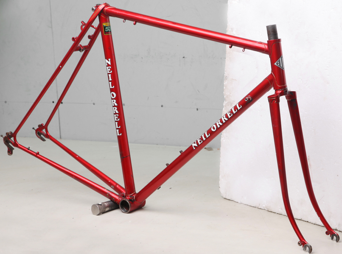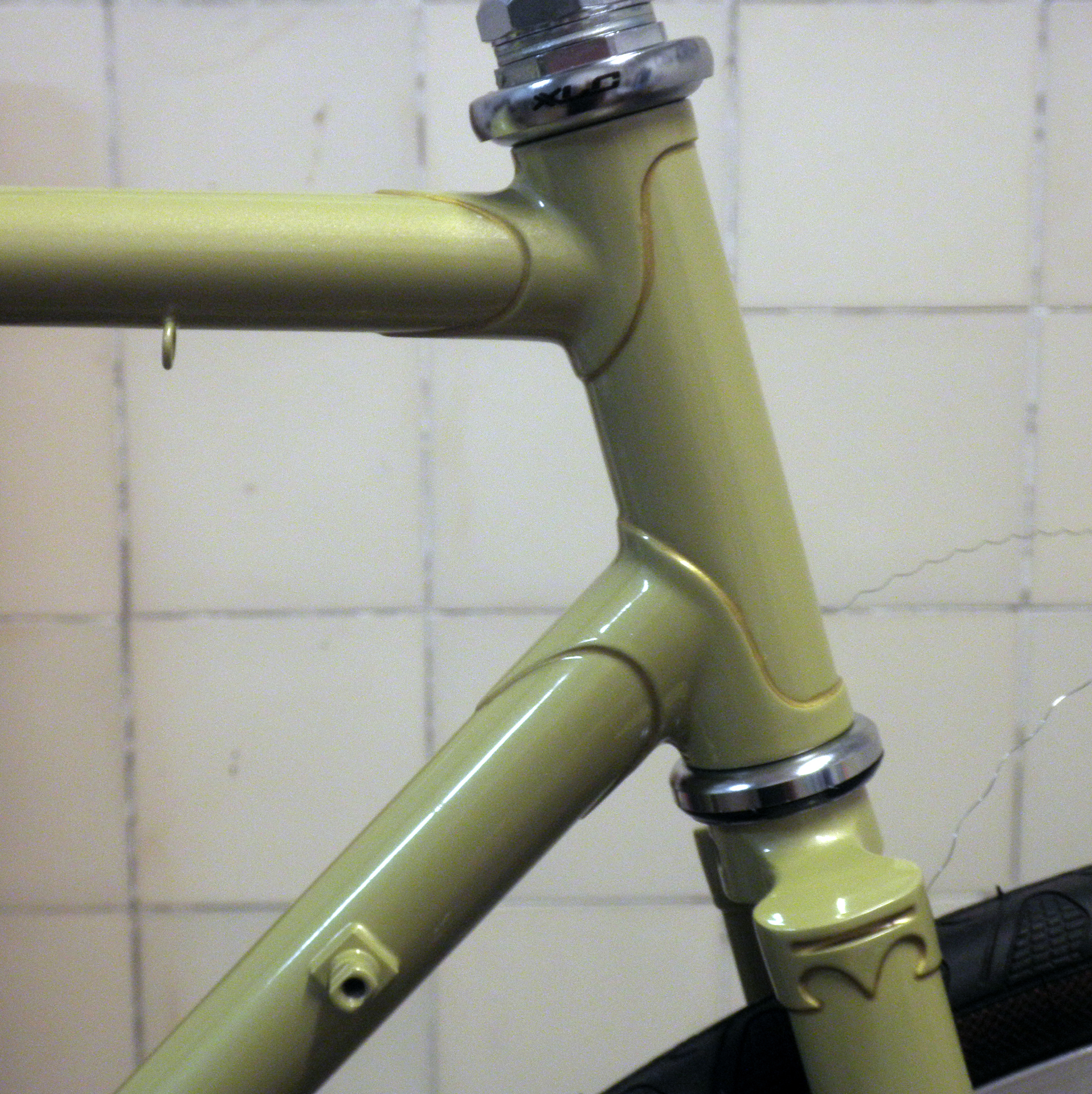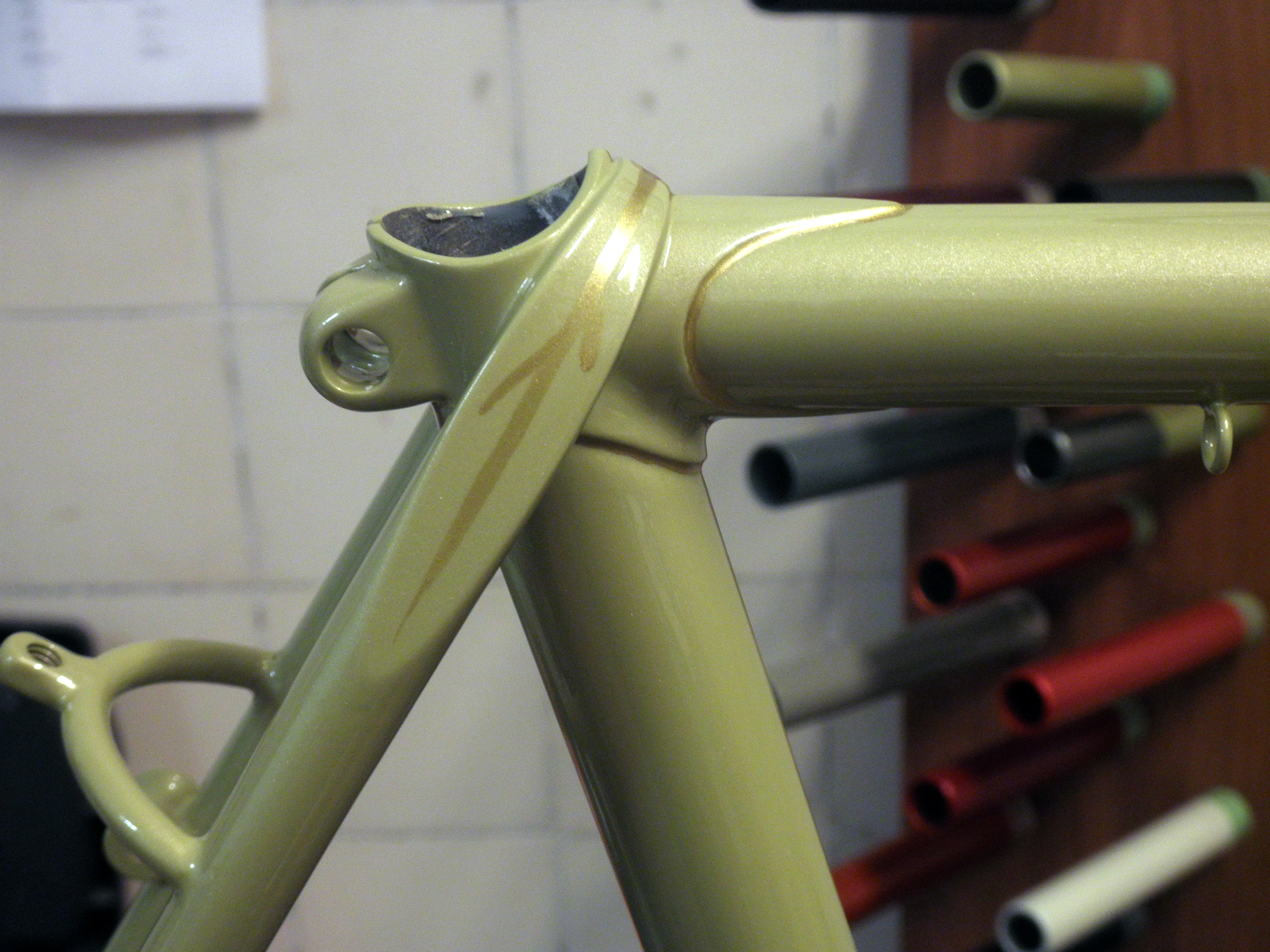 Diesen Rahmen hat er angangs 80ern gebaut. Eine saubere Arbeit, recht dünn gefeilte Muffen, typisch alt-britische Sattelstrebenaugen, mit hübscher Linierung.