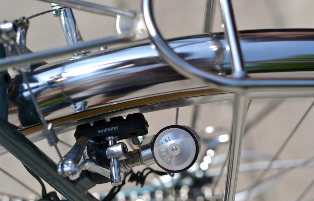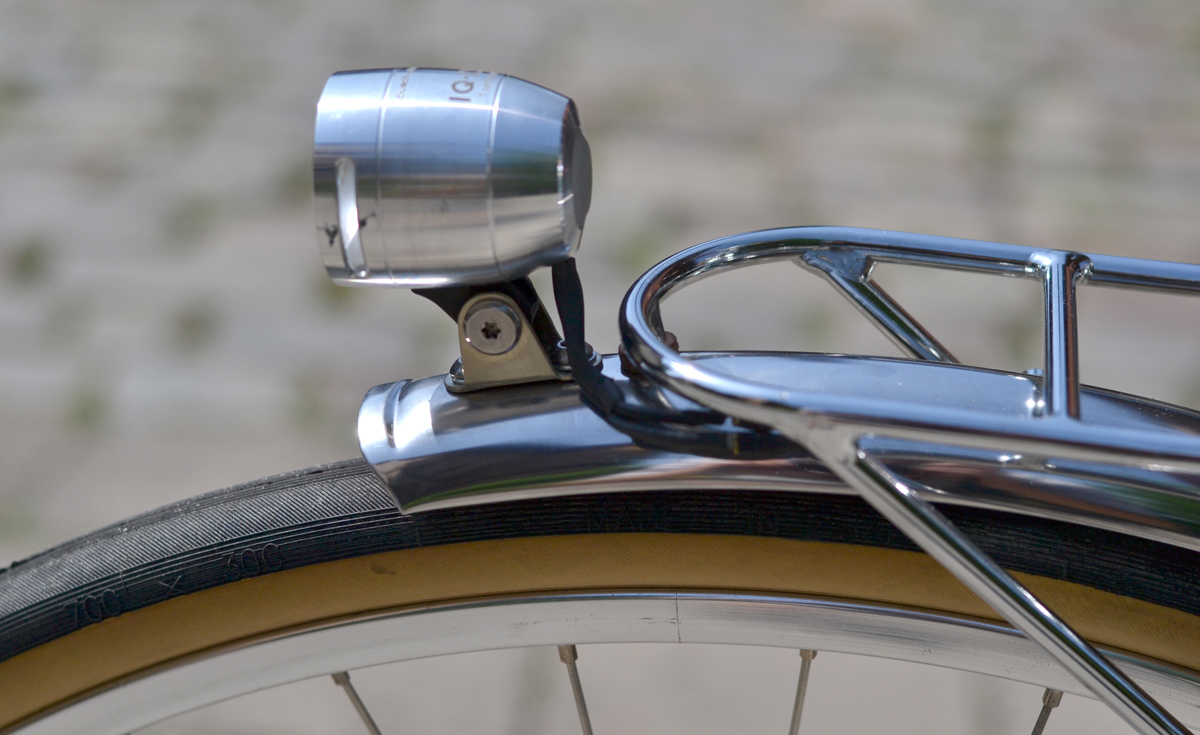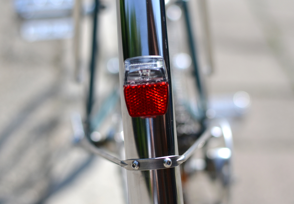 Strom für das Licht wird vom Velogical Dynamo gespeist. Ein feines Design. Bei normaler Cantisockel-Montage aber wäre der zierliche Dynamo mit Bremsgummi kollidiert. Ich mußte ein wenig basteln. Es funktioniert, für meinen Geschmack aber etwas zu filigran. Etwas stabilere Befestigung und Umlegefeder fände ich besser. Licht vorn ist B&M, hinten Hermanns. Für Vorderlicht habe ich einen Halter auf Schutzblech gebastelt, der evtl. auch eine Schutzblechstrebe aufnehmen kann.
