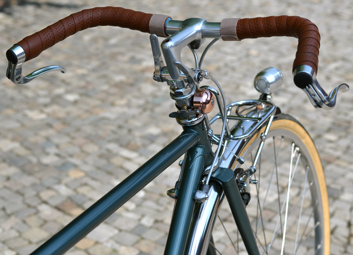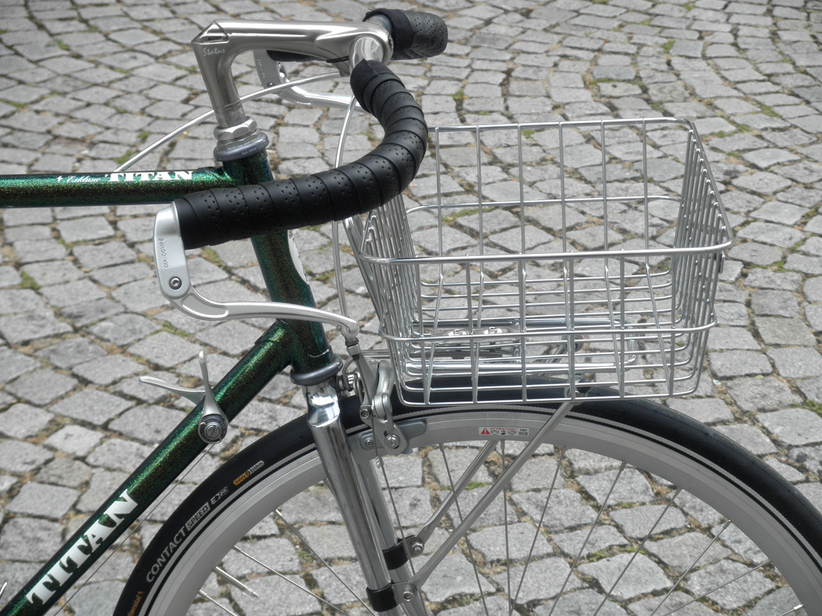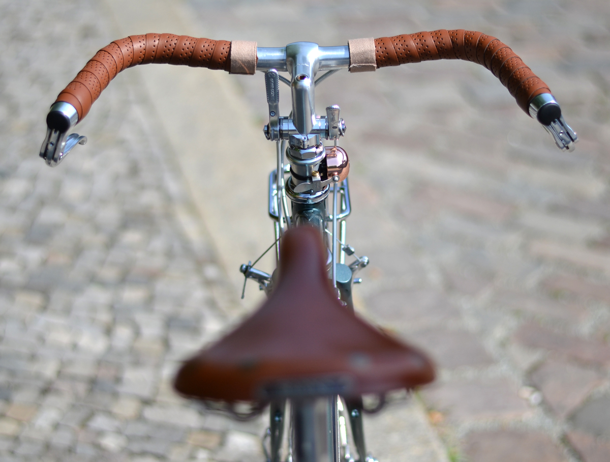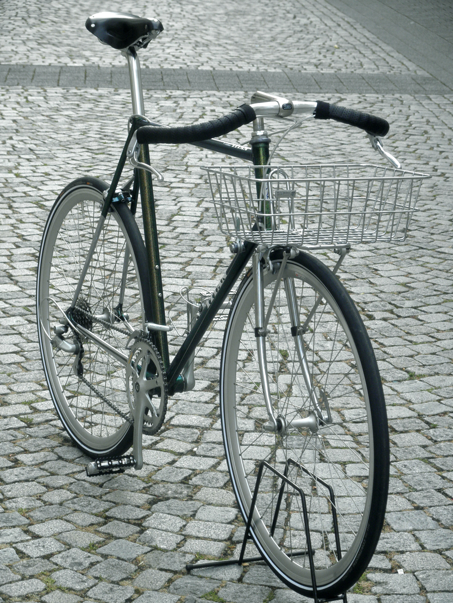 Auf Wunsch wurden einige Teilen ersetzt, Northroad Lenker statt Rennlenker, dazu Inverse-Bremshebel von Gran Compe, längerer Vorbau von 3TTT, BLB-Gepäckträger incl. Korb, Patentsattelstüze statt Stütze mit Sicken, Brooks Professional, hohe Aerofelgen(eingespeicht mit Sapim Race Speichen), Conti Contact Speed Reifen, MKS-Sylvan Touring Pedale.