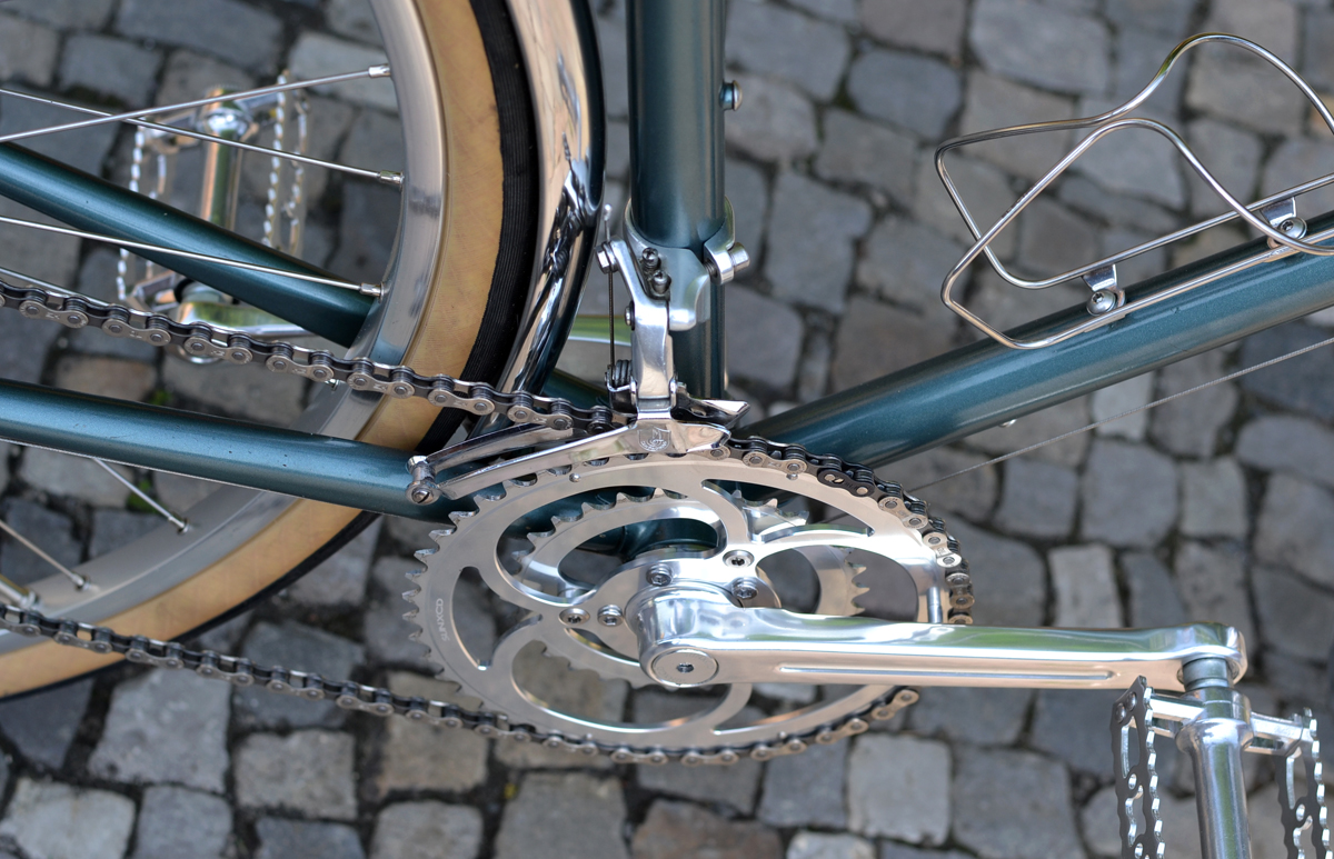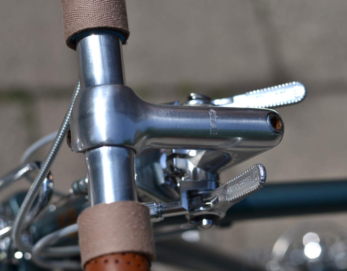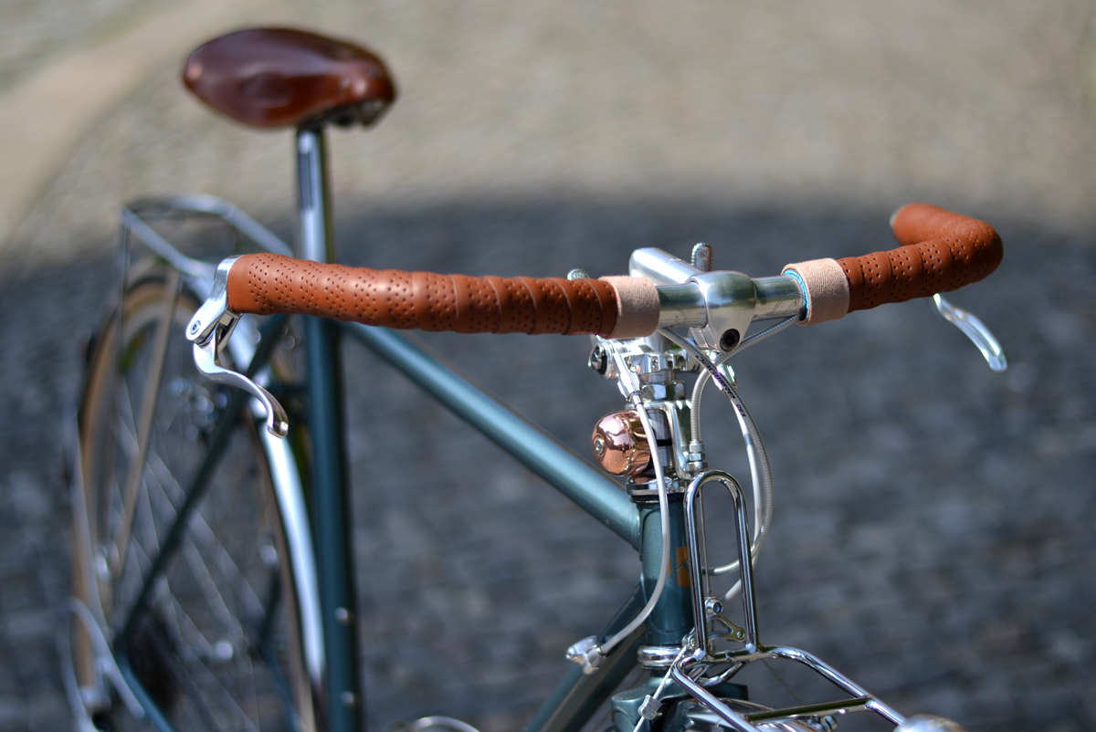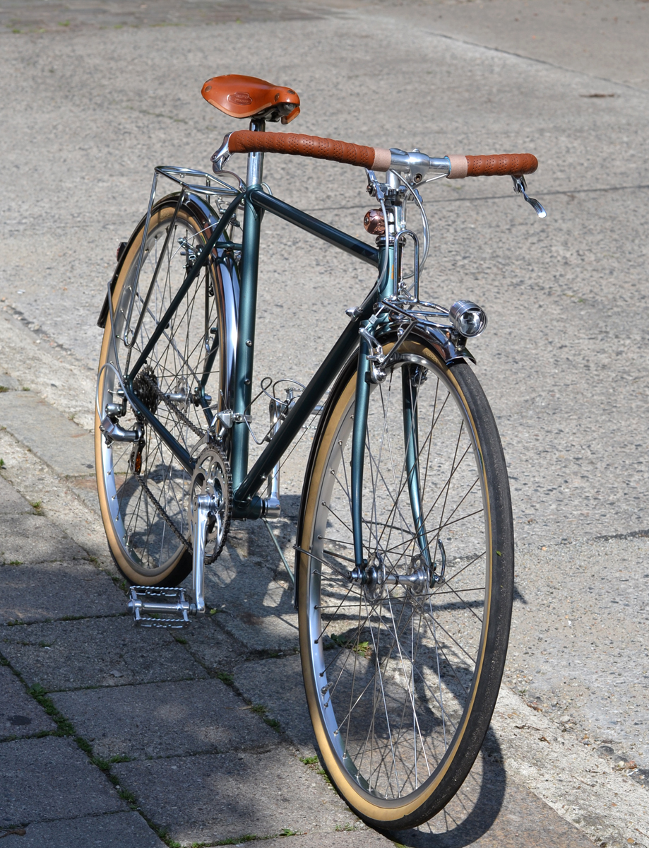 Auf Wunsch wurden einige Teilen ersetzt, Northroad Lenker statt Rennlenker, dazu Inverse-Bremshebel von Gran Compe, längerer Vorbau von 3TTT, BLB-Gepäckträger incl. Korb, Patentsattelstüze statt Stütze mit Sicken, Brooks Professional, hohe Aerofelgen(eingespeicht mit Sapim Race Speichen), Conti Contact Speed Reifen, MKS-Sylvan Touring Pedale.