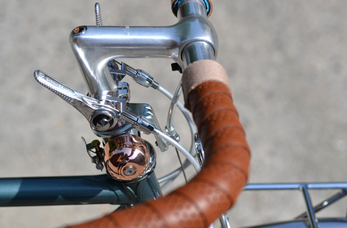 Auch die Lenkung ist klassisch. 1″ Gewindesteuersatz, Cinelli Vorbau und Philippe-Helvetia-Lenker. Bremshebel ist Tektro. Die Züge laufen durch die Lenkerinnere. Zum Glücl war der Gabelschaft lang so daß eine gute Position für die Fahrerin möglich wurde, obwohl der Rahmen ein wenig klein für sie ist. Klingel fand seinen Platz an Spacer.