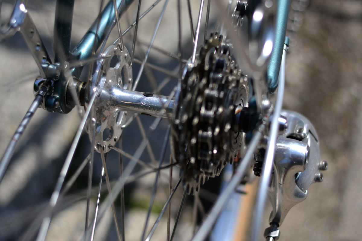 Antrieb ist unkompliziert. Gewühnlicher Shimano-Innenlager(einziges Shimano-Teil an diesem Rad,,), um problemlose Innenverlegung der Lichtkabeln zu ermöglichen, Sun XCD Kurbel + 2faches Kettenblatt a la Herse, 5facher Ritzelpaket von Suntour. Damit kommt man fast auf 1:1 Übersetzung, um mit Gepäck und bei Gegenwind die Uckermärkische Hügellandschaft locker freudig fahren zu können. Geschaltet wird mit einem Vorbauschalthebeln von Gran Compe. Er hat recht feine Verzahnung. Damit könnte man auch 10fache Cassette schalten ohne Index. Schaltwerk und Umwerfer sind Campagnolo Veloce. Begrenzungsschrauben mußte ich austauschen für 5fachen Ritzel. Pedale sind MKS Sylvan Touring, ein Standard für klassischen Tourer.