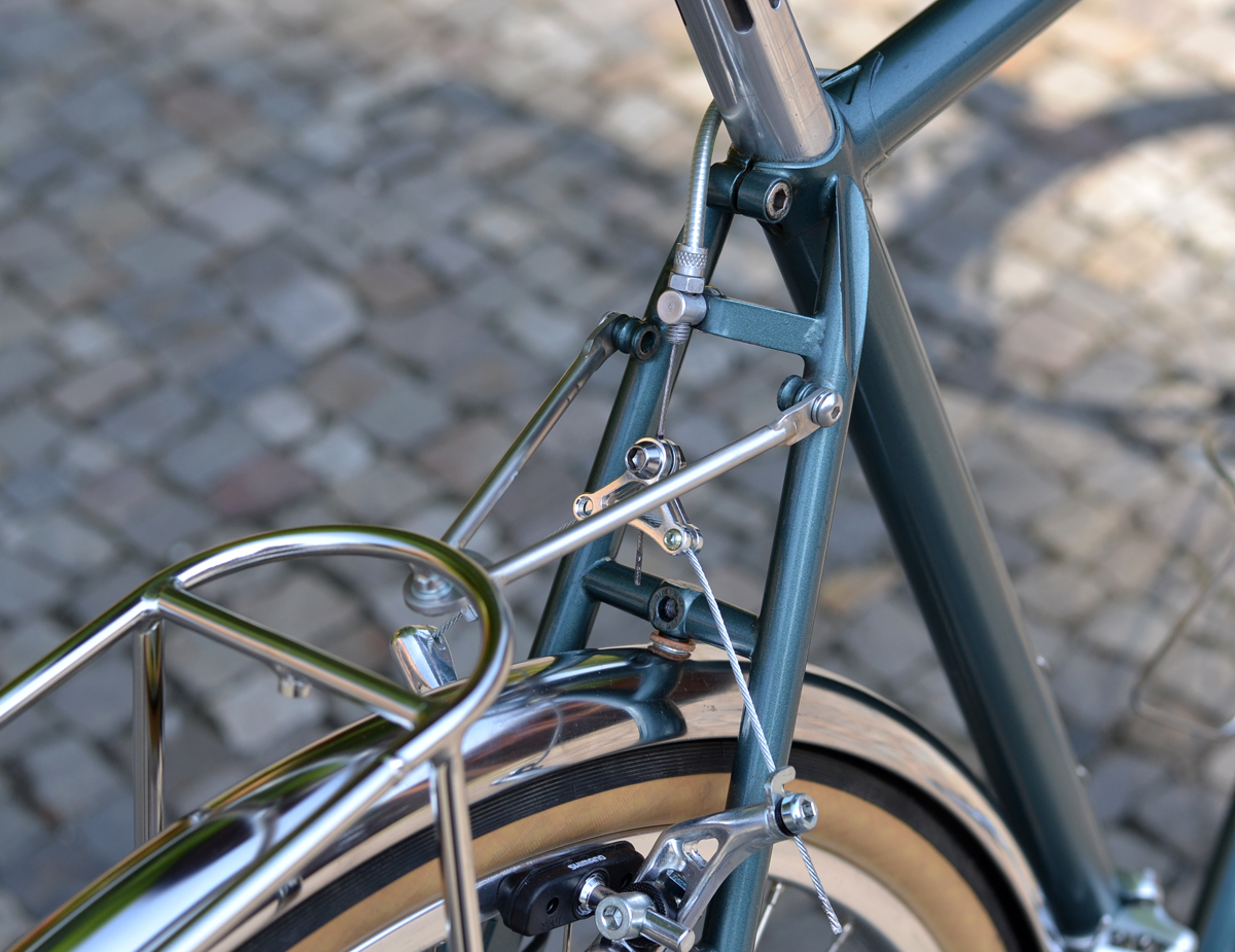 Für eine kleine Reise bis 3 Tagen würde eine Fronttasche reichen. Für längere Reise Paniertaschen hinten dazu. Also Gepäckträger vorn ist von Nitto, Träger hinten von Velo Orange. Für vorn gibt es passende Tasche von Gout Watanabe, Tokyo. Hinterer Gepäckträger ist hoch gehalten, um genügende Plätze für Ortlieb u. Co. zu gewähren. Halter habe ich passend konstruieren müssen, und gebaut von Kollegen SeLi-Rahmenbau.