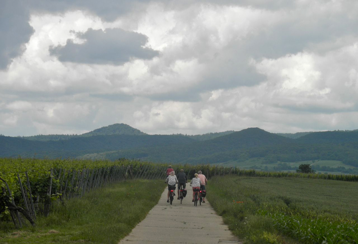 Dort den Stadtkern anschauen und Mittag machen. Es ist nicht leicht für Vegetarier in der Pfalz. Wir finden bei einem Griechen ein gutes Mittagsessen. Gleich wird auch Kaffe und Kuchen erledigt. Schon gut zufrieden radeln wir weiter nach Wissenbourg. Die Weinberge hier sind wellig geschwungen, die Wege gehen auf und ab. Ich mache mir Sorge daß der Hamburger seekrank werden könnte.