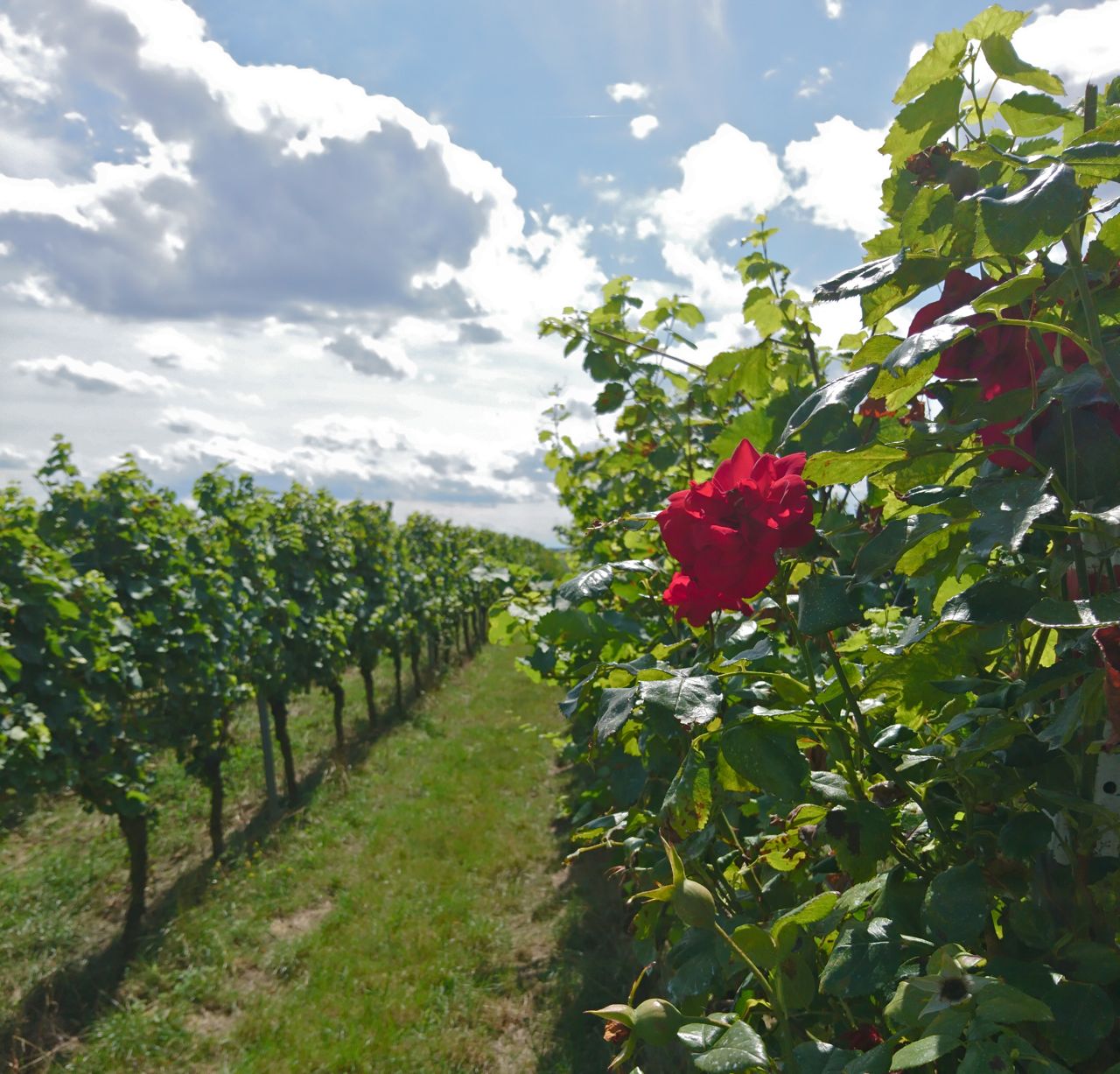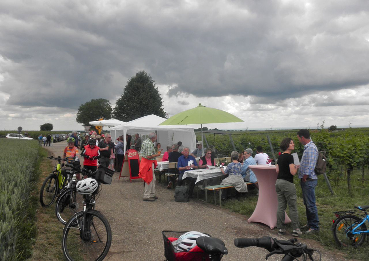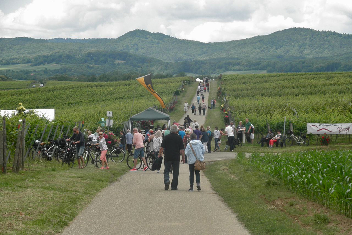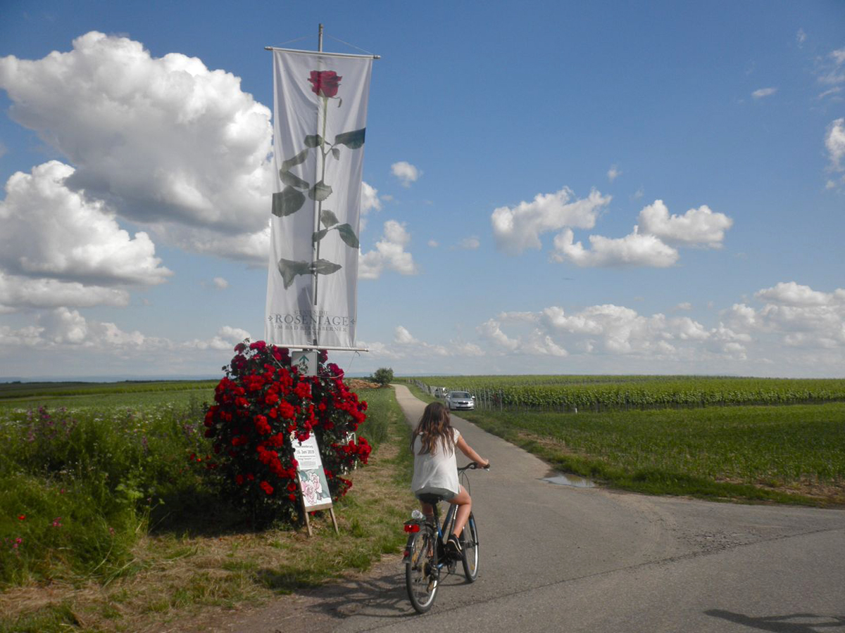 Kapellen-Drusweiler, ein Winzerdorf unweit von Bad Bergzabern, macht jedes Jahr Rosenwandertag. Rosenpflanzung am Weinberge ist Überbleibsel alter Weinbautechnik. Beim Pilzbefall waren die Rosen zuerst dran. So konnte man rechtzeitig Maßnahme greifen. Heute sind die Rosen touristische Dekoration/Attraktion. Heute stellen die Winzer Stände auf sonst ruhige Weinberge. Zahlreiche Wanderer/Radfahrer kommen, und geniessen Wein und Verpflegung.