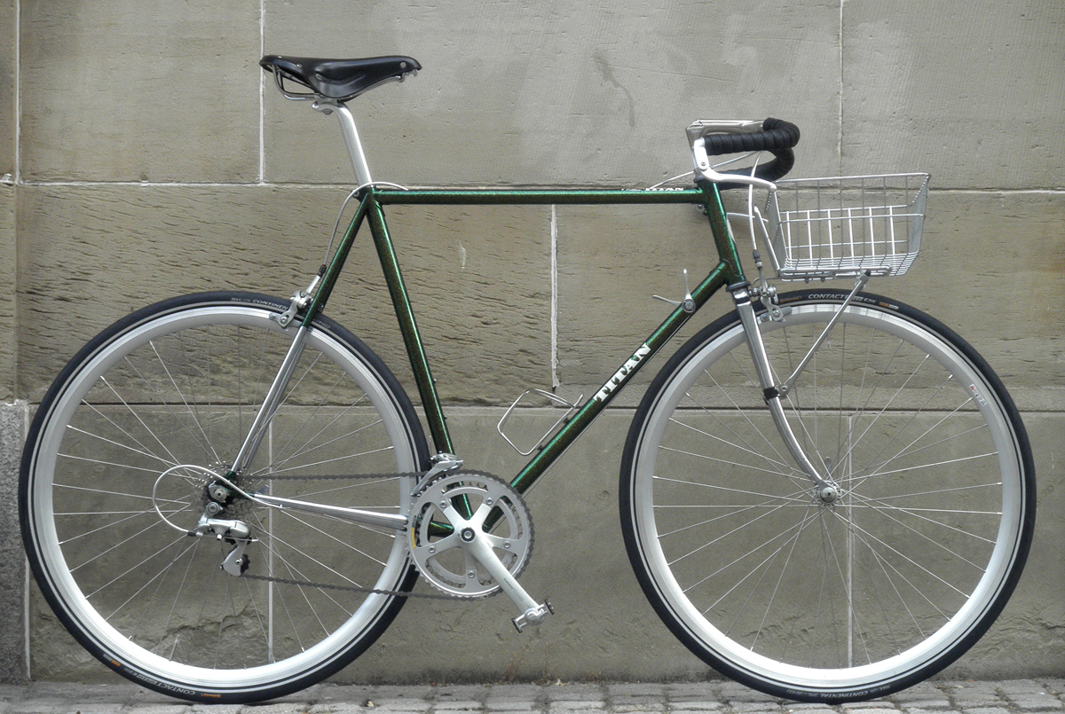 TITAN, ein schweizer Fahrradhersteller, baute solide und gute Rennräder. Ursprünglich bestückt komplett mit hellgrauer Shimano 105 Gruppe, 2×7-fach.