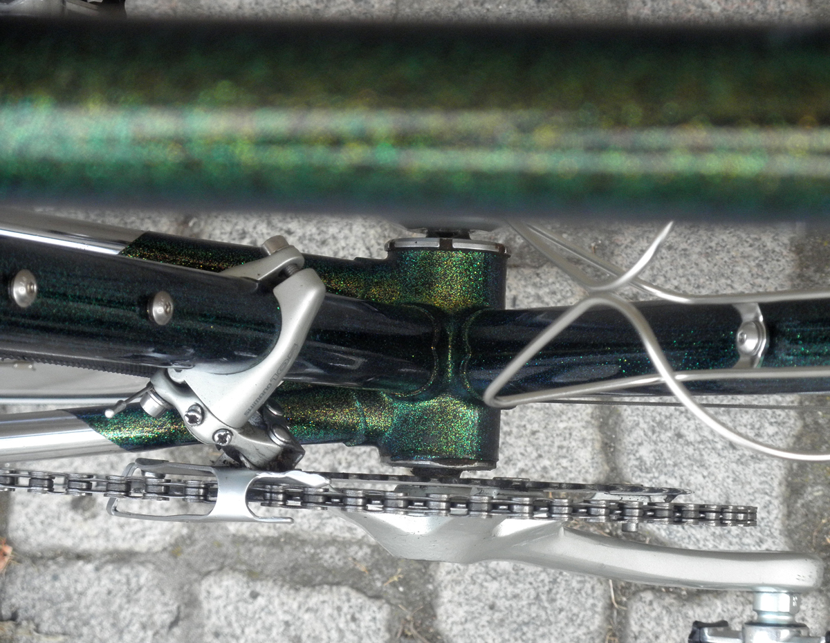 Der Rahmen und die Gabel, eingeliefert von der Auftragsgeberin, ist ein Maßrahmen gebaut von Holger Koch, Kassel, schätzungsweise Ende 80er, ist bestückt mit interessanten Details. Koch baut keinen Rahmen mehr. Der Lack ist auch original, ich glaube eine Mercedes-Farbe.