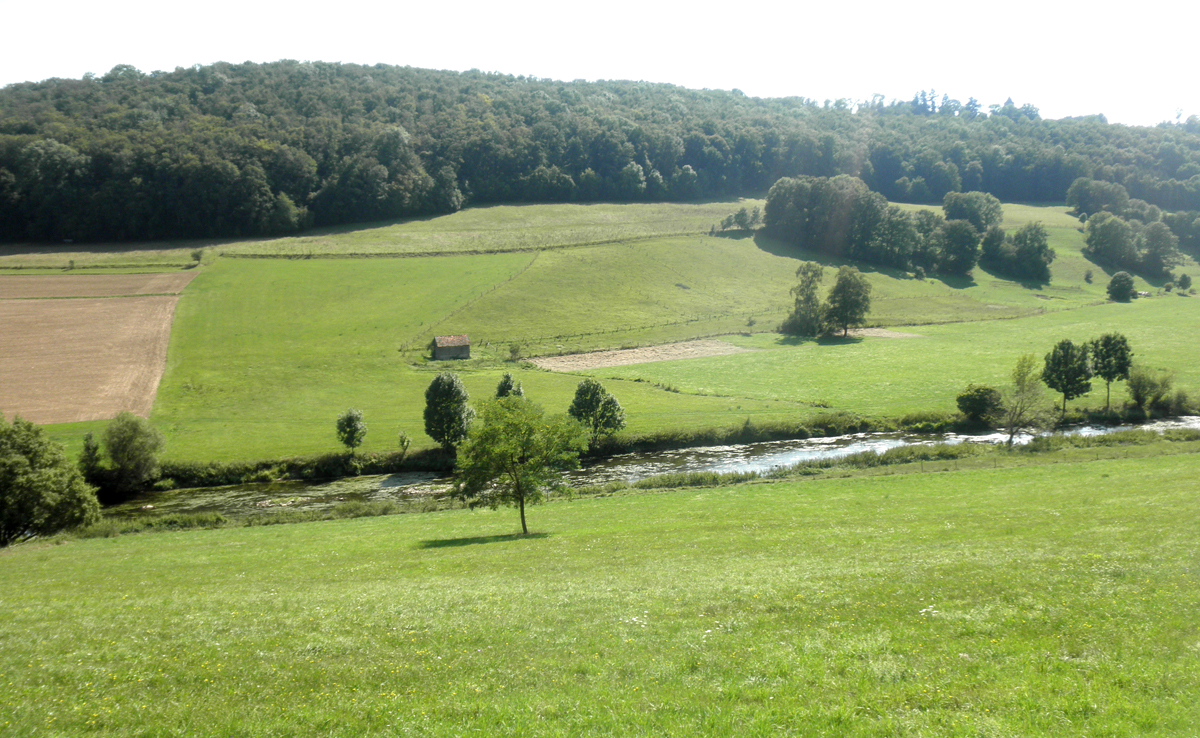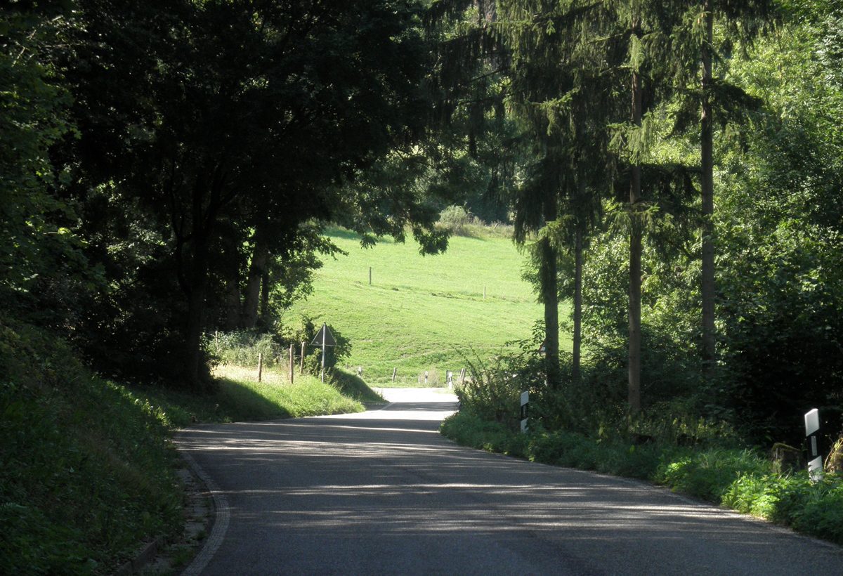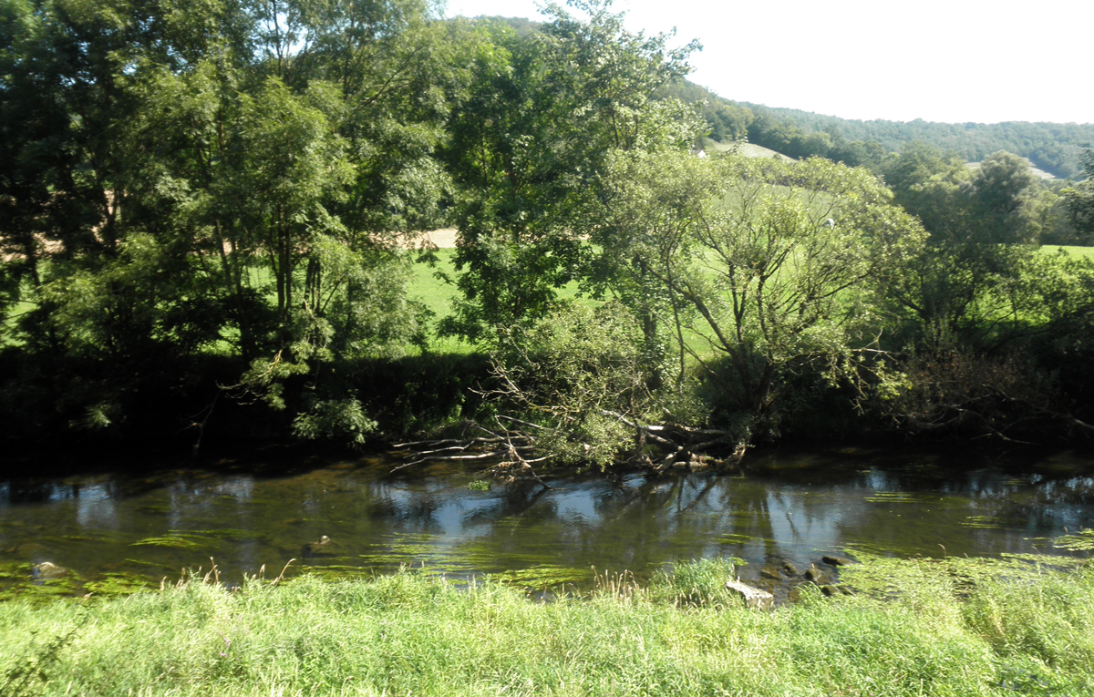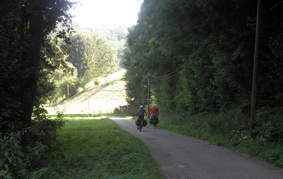 Eine kleine Abkürzung durch den Wald, dann bin ich schon unten auf Flußebene. Diese Gegend ist sicher strukturschwach. Die Landschaft ist aber wirklich lieblich.