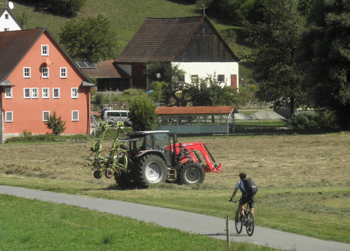 Langsam wird der Tal oft enger und der Radweg auch etwas welliger. Es wird nicht langweilig hier. Und ich sehe einige Radfahrer mehr, aber immer noch recht wenig. So etwa einen Radfahrer/eine Radlergruppe pro halbe Stunde,, Es ist doch noch Ferienzeit hier im Süden. Natürlich ist es angenehm für mich, viel besser als volle Radwege wie an der Elbe.