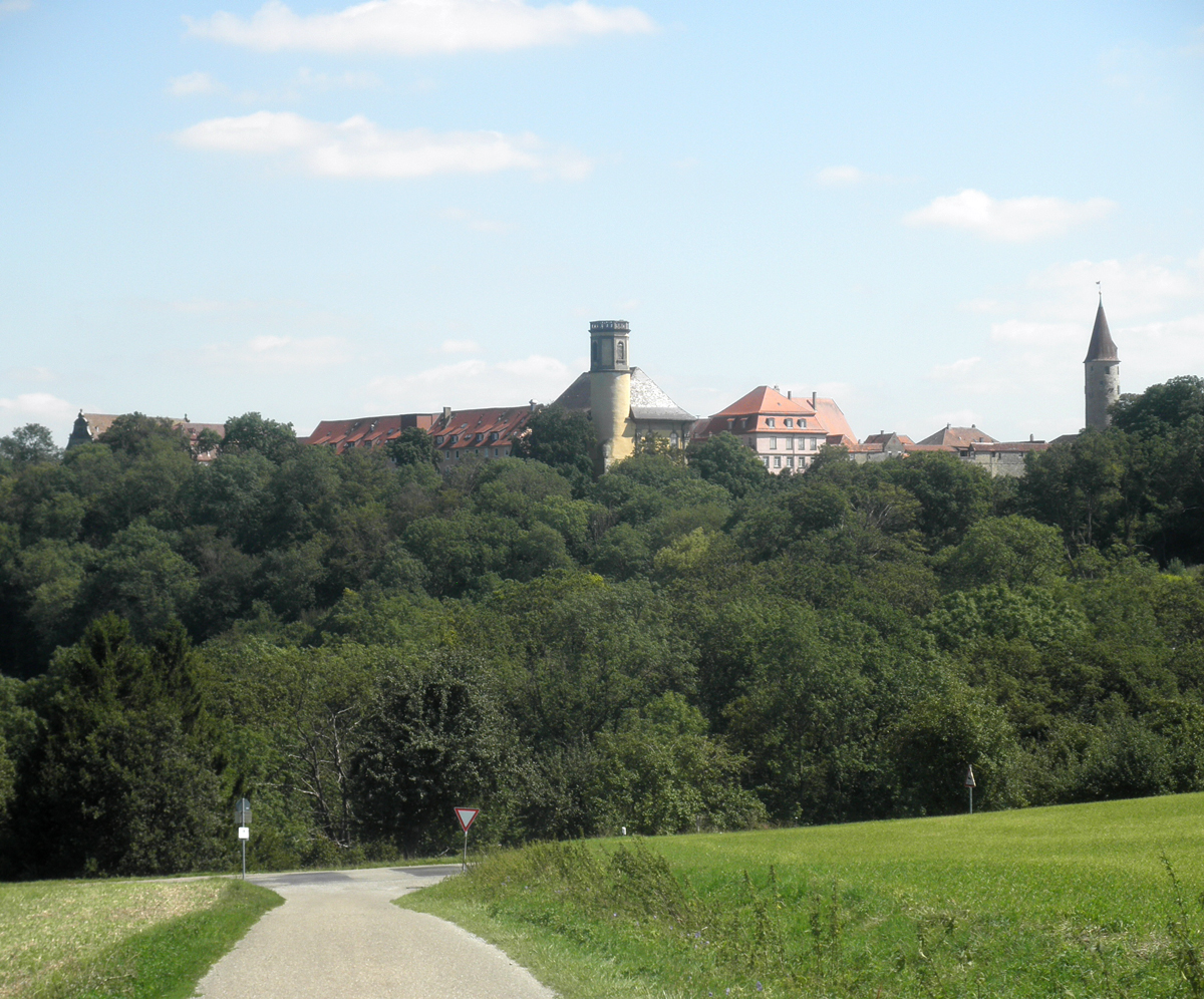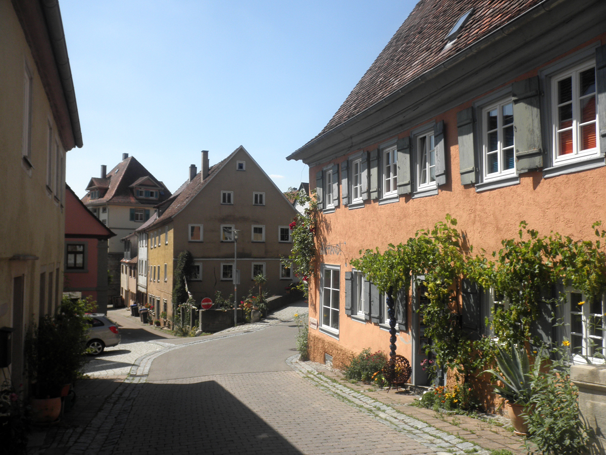 Der Tag ist bereits kürzer geworden. Erst gegen 06:30 geht die Sonne auf. Wetterbericht sagt einen heissen Tag voraus. Ich möchte früh starten und ans Ziel kommen. Tram-S-Bahn fährt wacker mit hohem Tempo(etwa 100?). In Heilbronn hat die Strecke Strassenbahncharakter. Danach fährt der Zug wieder als Überlandbahn. Öhringen, 07:30. Die Stadt ist noch nicht ganz wach. Im alten Stadtkern sind viele intererssante Bauten vorhanden.