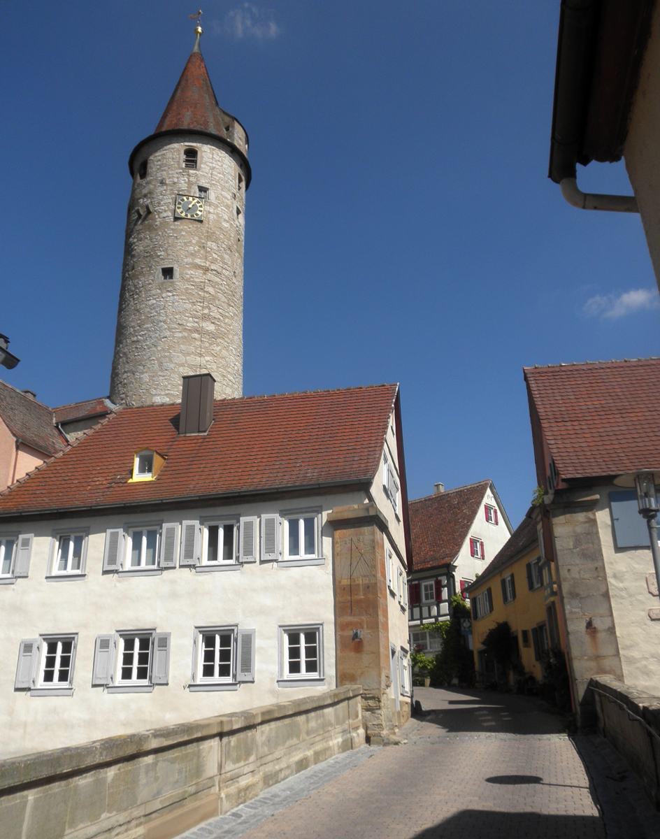Die Lage ist typisch für die alte vermauerte wehrhafte Kleinstädte. Langenburg ist es auch, Krautheim, Jagsthausen genauso. Aber die Dichte und Kompaktheit von Kirchberg erinnert mich ein wenig an Rothenburg. Hier sind Tore und Mauer vorhanden, darin dicht gebaute alte Häuser, Schloß(-burg) und Kirche. Eine Miniaturausgabe von Rothenburg,, Von hier bis Rothenburg ist gerade 30 bis 35km, je nach Routen. So kann man von Jagst- auf Tauber-Radweg umsteigen. Und was noch erwähnungswert ist, gibt es hier, seit langem und immer noch, ein Kino, und einen Bioladen. Früh haben Künstler hier angesidelt.