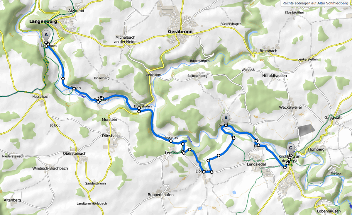 Ausfahrt von Bächlingen nach Kirchberg an der Jagst. Gerade 2x15km. Anfangs angenehm entlang Jagst. Ab Hessenau wird hügelig, da die Radroute Jagst verläßt.