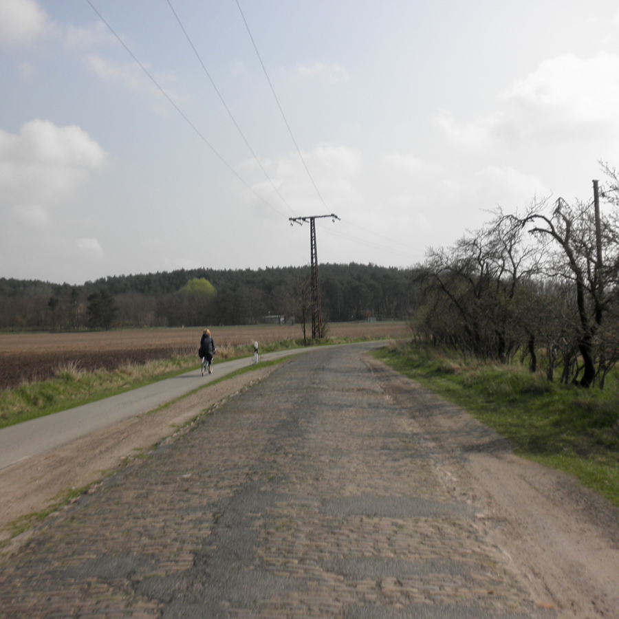 Und nun einzig nicht asphaltierter Streckenabschnitt heute. Ein Paar Kilometer bis Wustrau, entweder Kopfsteinopflaster oder relativ fester Sandweg nebenan. Das ist ohne Problem machbar, auch für Rennradreifen. Ich würde alle meine Rennräder mit Conti GP 4 Seasons 28mm ausrüsten. Das wäre aber auch viel Geld.