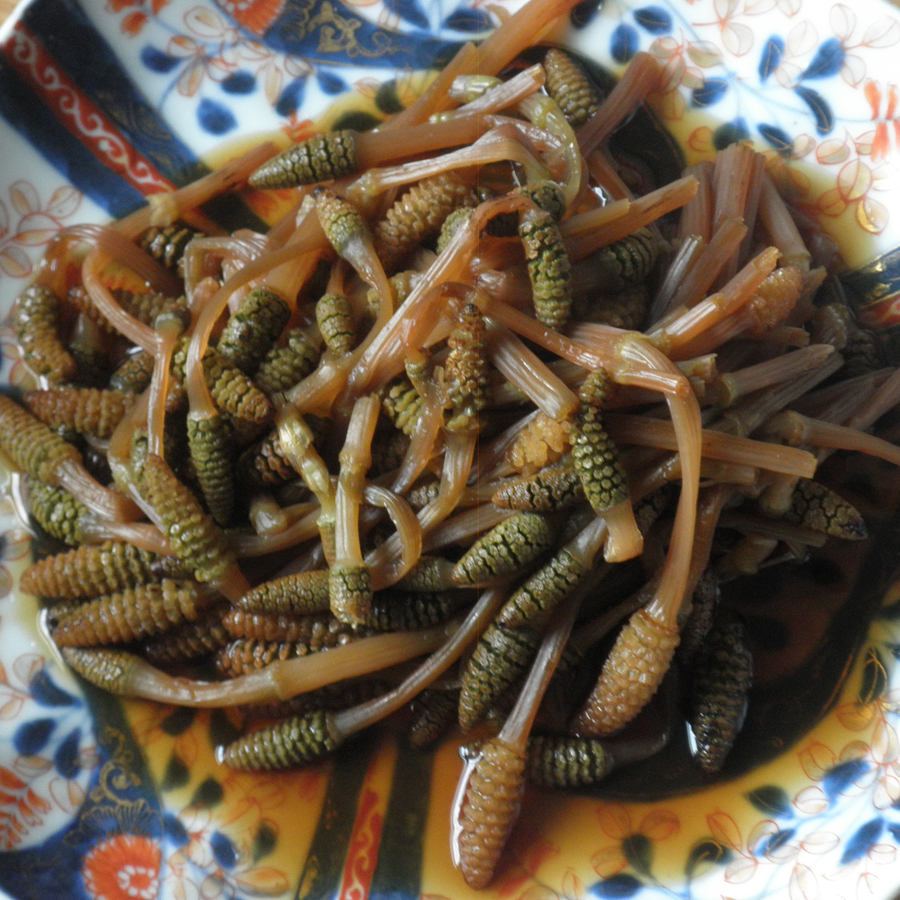 Ich fürchte, nur Japaner essen das, Ackerschachtelhalm,,, Dort ist er ein Symbol des Frühlings. Hierzulande sieht man ab Mai die grüne Triebe, auf dem Acker, am Wegerand oder am Deich. Die Sporenähren treiben eher, im März/April und sind nicht ganz leicht zu finden, da sie vom weiten wie trockene Grashalme aussehen. Sie sterben nach dem Ausstäuben ab. Der Zeitraum ist recht kurz, diese Sporenähre zu finden.