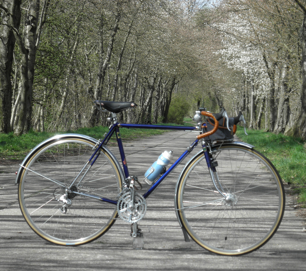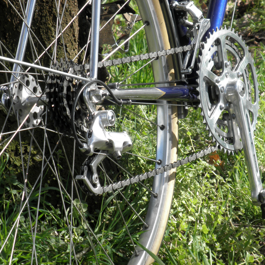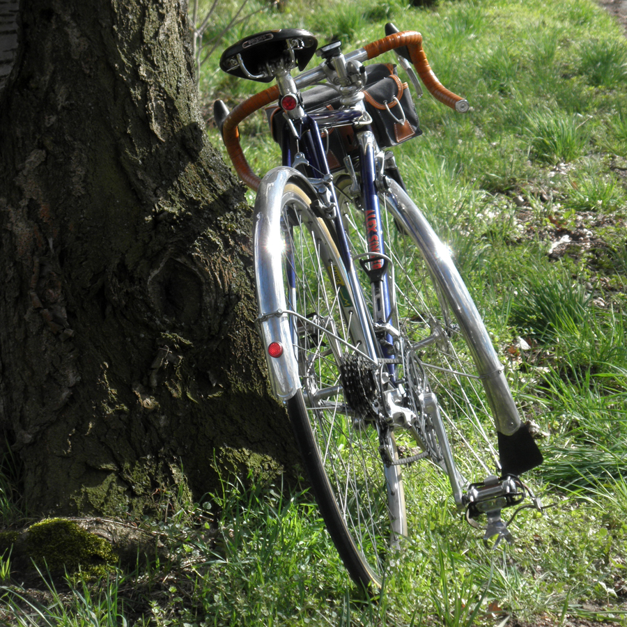 Jahrgang um 1990, recht praktisch aufgebaut mit den damals modernen Teilen. Trotzdem hat das Rad eine Aura von traditionell französischen Sportifs/Randonneuses. Nicht französische Teile sind, nur Bremshebel und Brooks Sattel(was bei Singer mehr der Fall ist als Ideale). Haha, Sachs von damals wurde als französisch verstanden. Auf den Fotos sind der Ersatzradsatz mit Campa Nuovo Tipo Naben und Grandbois Reifen zu sehen. Original ist natürlich Maxicar-Naben und Michelin Elite Reifen dran.