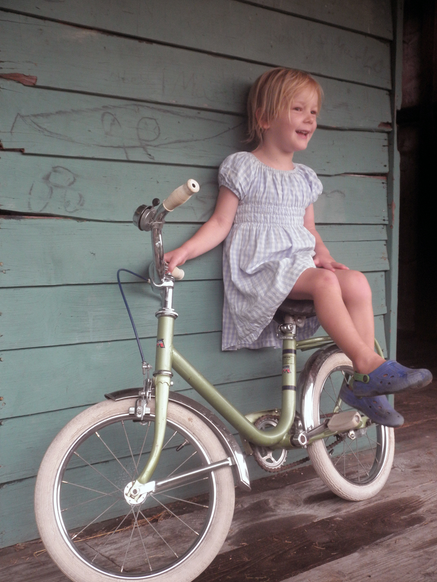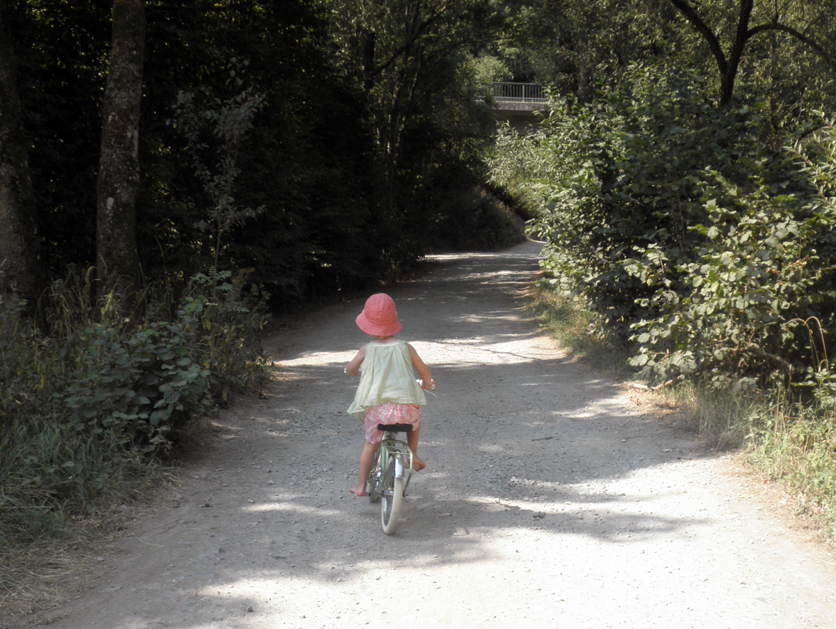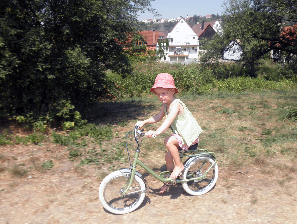 Kinderräder sind heute meist sehr bunt, mit greller Grafik versehen. Dagegen waren sie in den 70ern bis 80ern recht gediegen. Ob das besser ist, weiß ich nicht, aber sorgfältig gestaltet finde ich sie schon. Für mein Patenkind habe ich aus Frankreich so ein MotobecaneKinderrad im Originalzustand ergattert. Nun war es so weit, da das Mädel ihr bisheriges Rad kaputtgefahren hat. Sie konnte das neue Rad im Ferien auf dem Land ausgiebig testen.