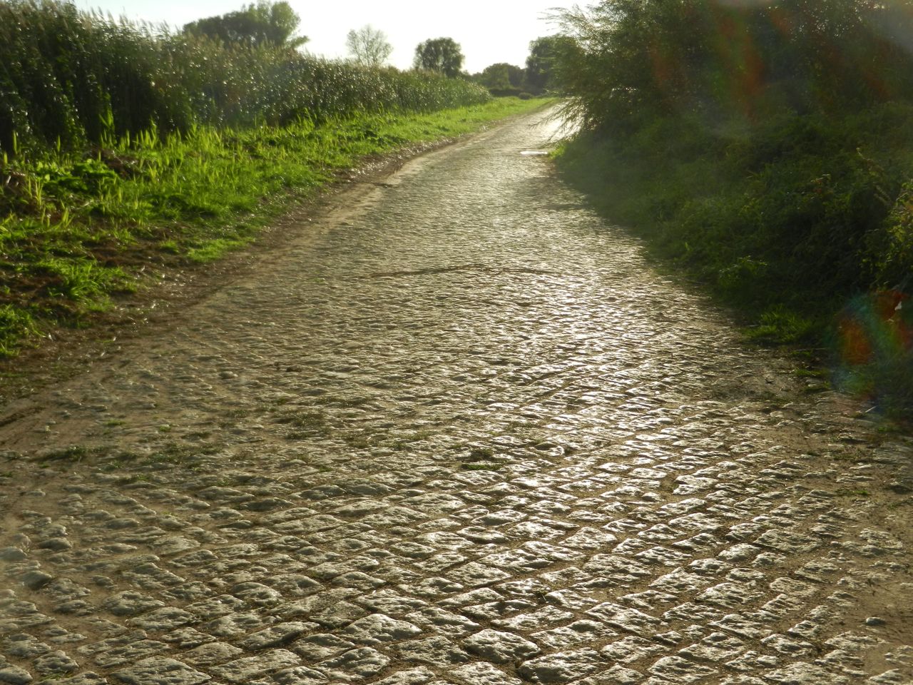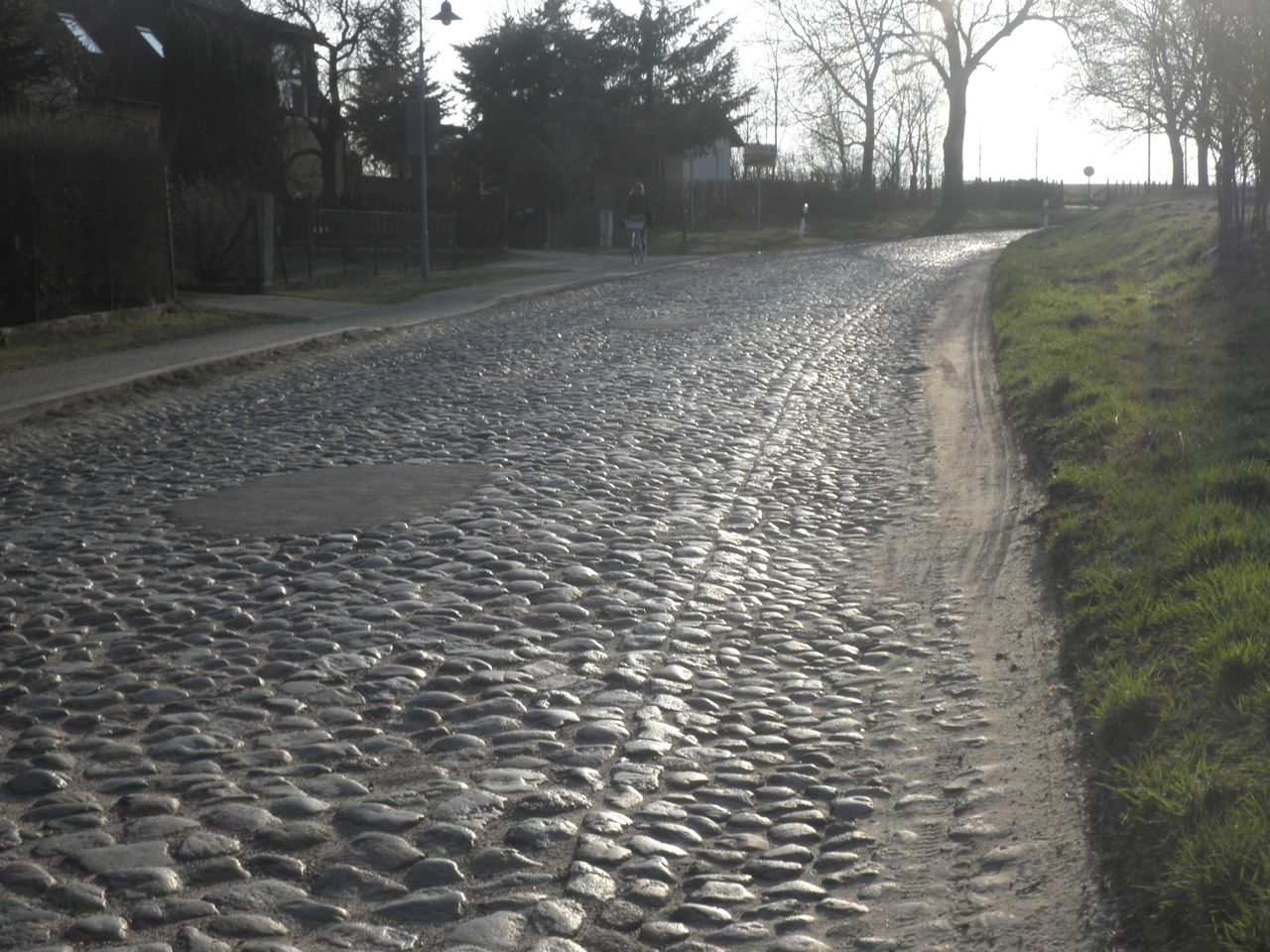 Kopfsteinpflaster ist auch für Städter bekannt. In der Stadt sind sie aber meistens recht flach und dicht verlegt. Dörfer in Brandenburg haben oft erstaunlich runde Steine, die auch noch so grob mit großem Fugenabstand verlegt sind. Das sind echte Killer. Ähnliches sieht man auch oft im Wald, wahrscheinlich ehemals wichtige Wege zwischen Dörfern. Sie werden nicht schlammig nach dem Regen, aber diese Hoppelwege kann ich nicht lieben.