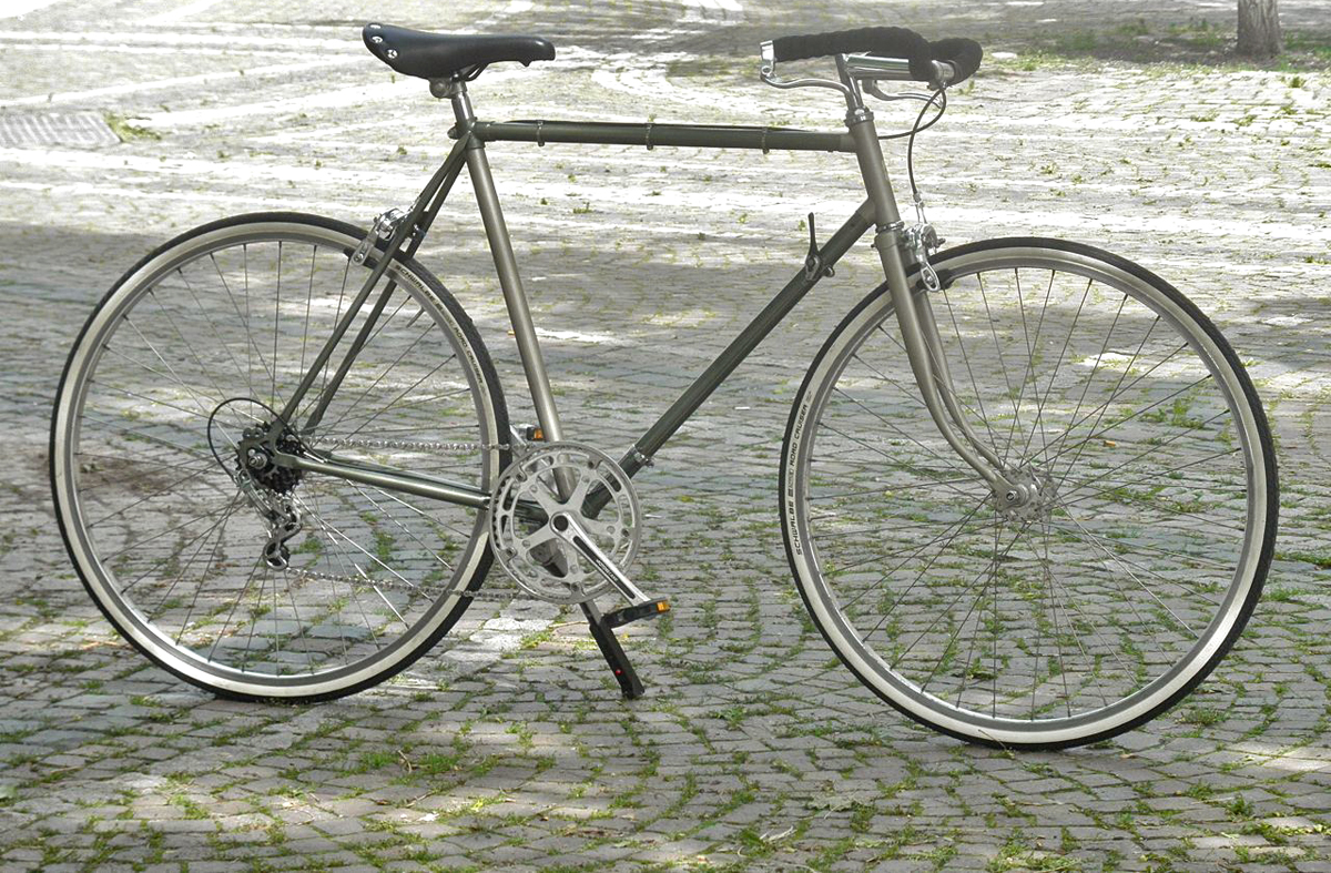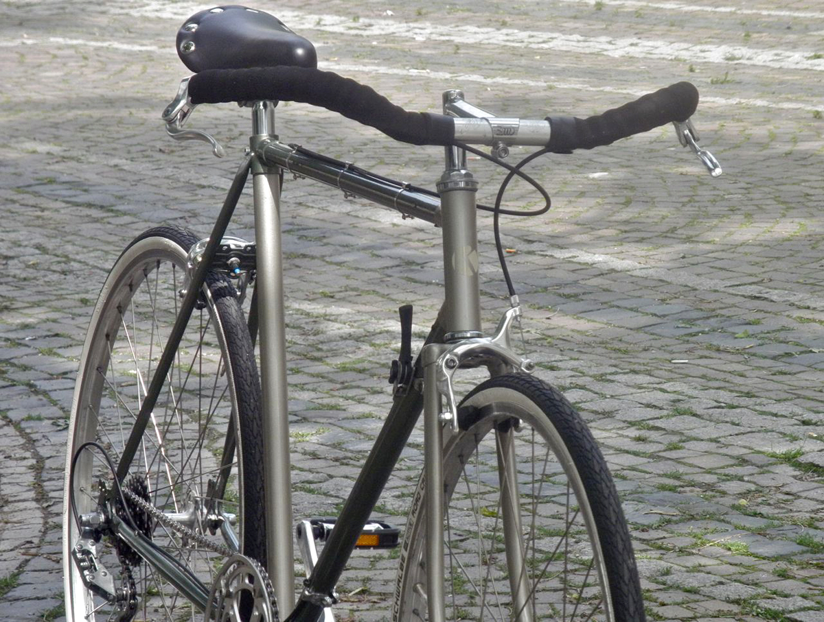 einfacher Rahmen von CONDOR(ca. 1980), Sachs-Maillard 6-Gang Ritzelpaket, Sachs-Huret Schaltwerk, Simplex Schalthebel aus Kunststoff, Kurbel von Motobecane(Takagi/Japan), Naben von Normandy, Alufelgen von Weinmann, langschenkelige Seitenzugbremsen von Dia Compe, Inverse Bremshebel von tektro. Meiste Teile sind aus den 70ern/80ern. Schon damals eine einfache Technik, die aber gut funktioniert und frei vom Komponentenzwang des herstellers ist. Das gefällt mir besser als (unnötig?)vollgestopfte Fahrräder von heute. Dieses Rad gibt mir einen Eindruck von ruhiger Zufridenheit von sich. Schlicht, recht bescheiden, aber nicht blöd und zurückhaltend chic.