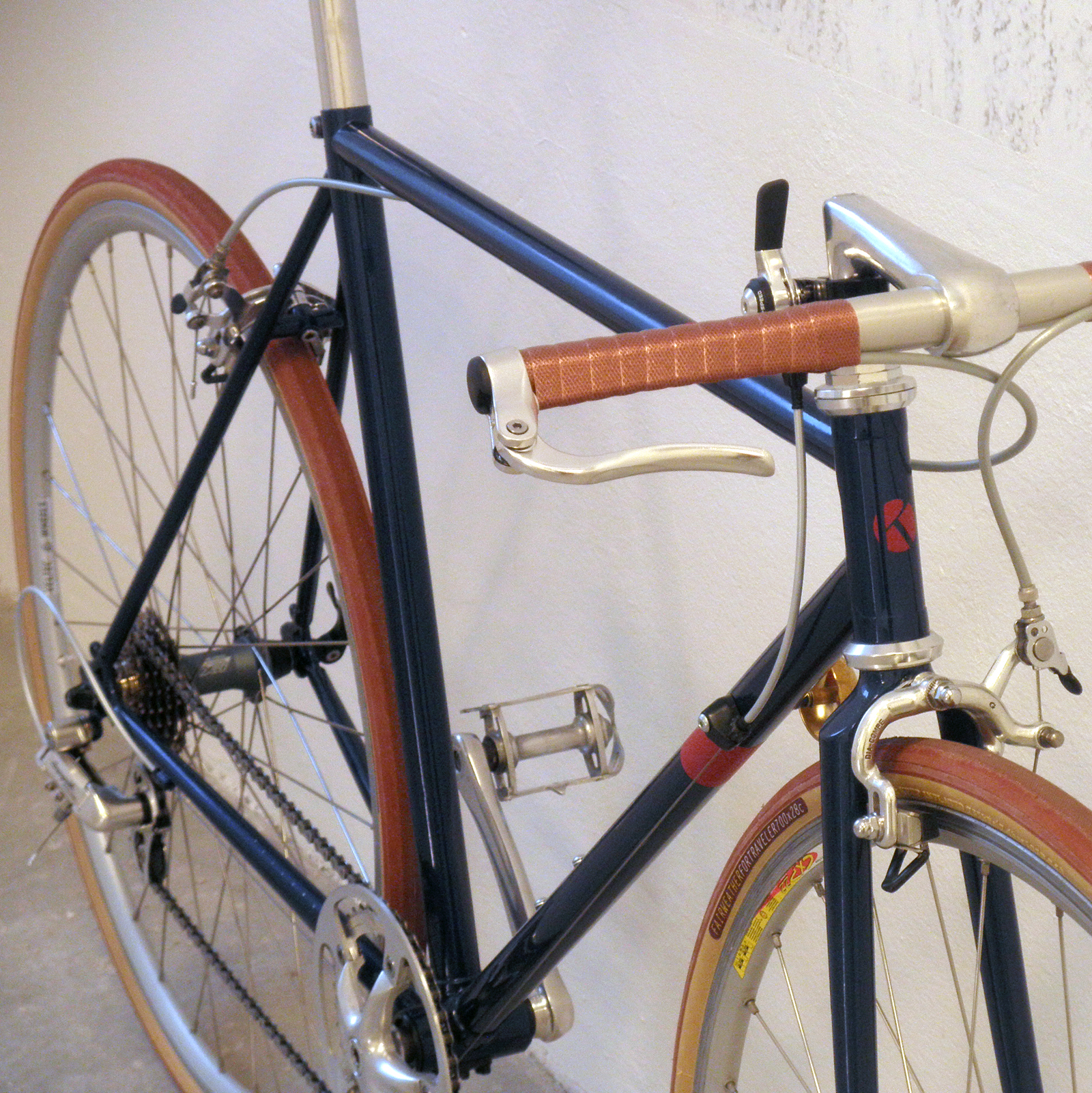 130mm Einbaubreite erlaubt den Einbau von 8, 9, 10 Gänge. Dann genügt vorne nur ein Blatt, um zügig in der Stadt unterwegs zu sein. Lenkerbreite 420mm, mit Inverse Bremsen von Tektro(Hebel habe ich 10mm gekürzt), Weinmann-Seitenzugbremsen, 9-fach Schalthebel von IRD am Vorbauschaft, Shimano 9-fach Cassette, Campa Schaltwerk, leichte Mavic CXP-Felgen, schöne Fairweather Reifen 28mm. insgesamt 9kg leicht. Genau gut genug, in Berlin schnell unterwegs zu sein. Mehr wäre dann ein Luxus, was auch nicht schadet.