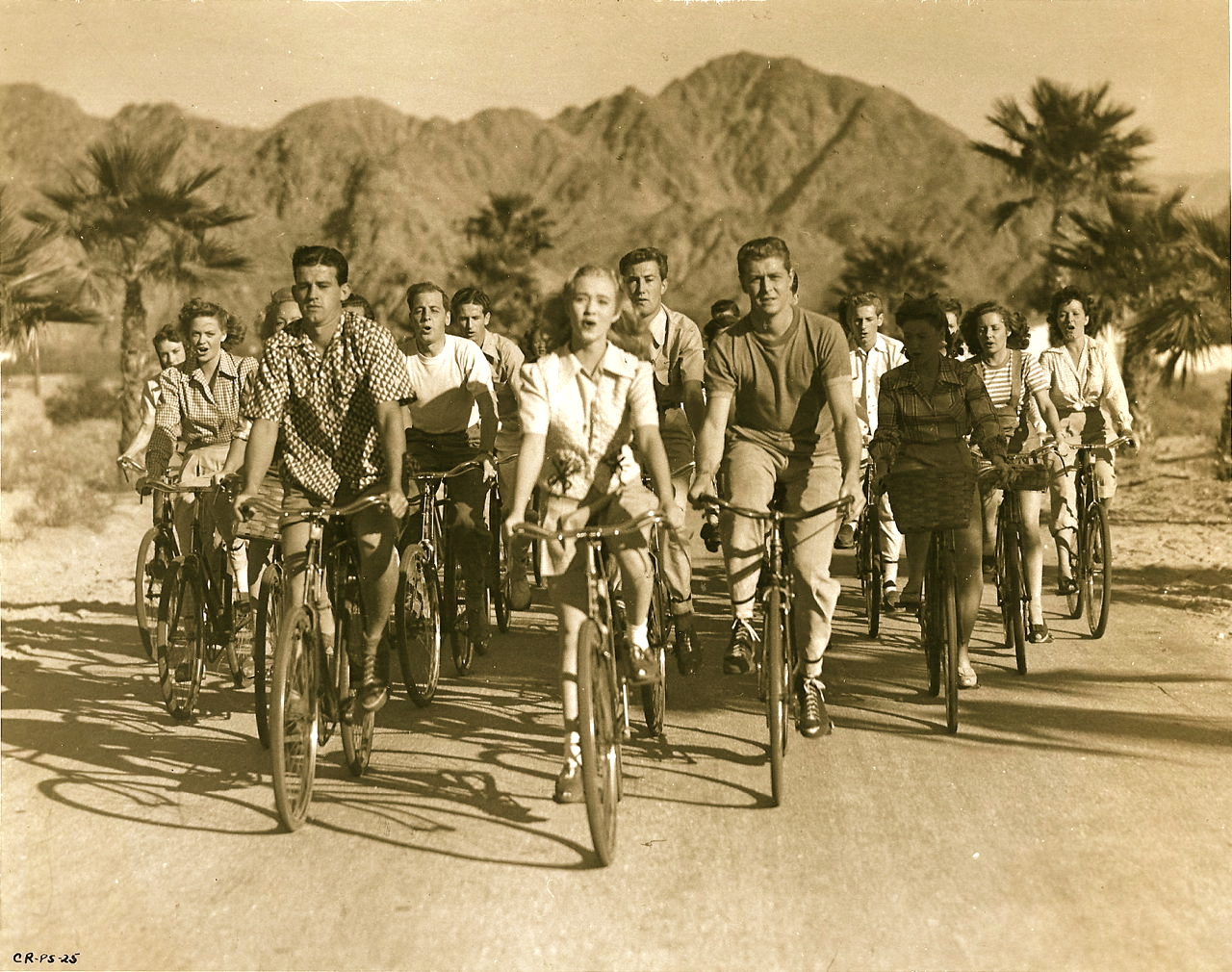 Linda Darnell in Begleitung mit eleganten Sporträdern, 1941.