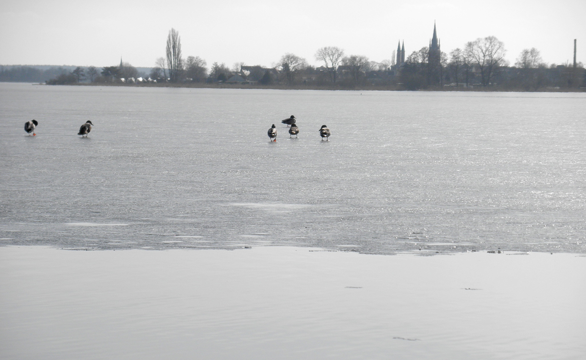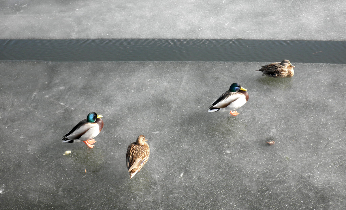 Enten machen Sonnenbad auf hauchdünn gewordenem Eis.